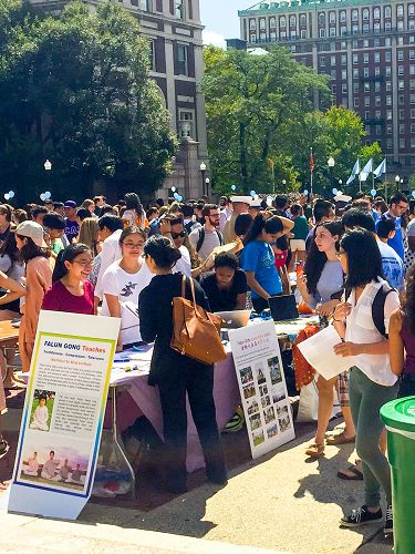哥伦比亚大学法轮大法俱乐部也像往年一样参与了这一活动,法轮大法俱乐部的桌子上有介绍法轮功的中英文材料,还有精美的纸莲花。许多人停下来观看世界各地学员炼功的照片,并签名参加每周在校园介绍大法的教功班。