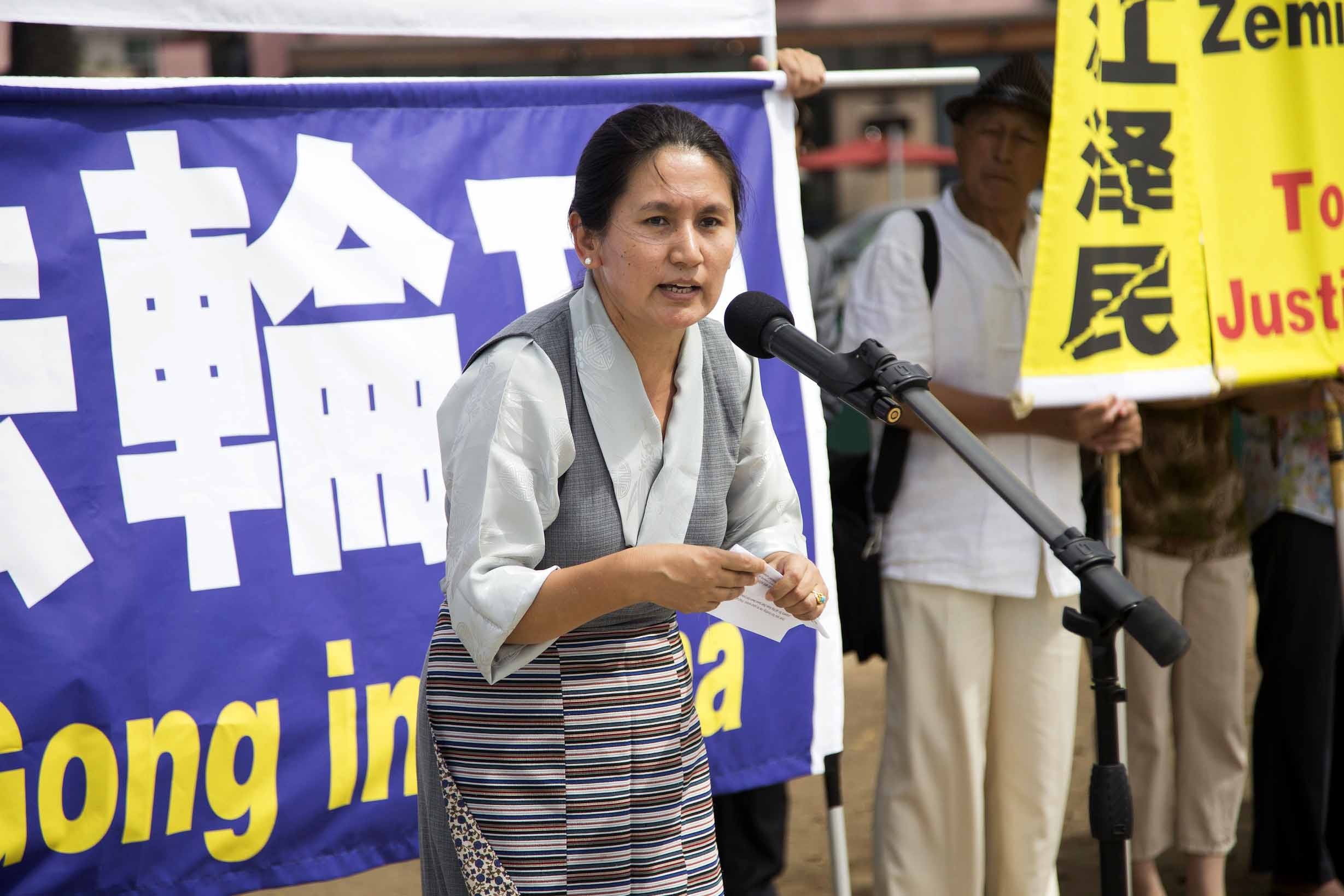 Yangchen Dolkar Gakyil说:“我们来支持法轮功的兄弟姐妹们。就像他们,我们同样遭受中共政府的迫害,每日都在煎熬,因为没有基本的人权保障。”