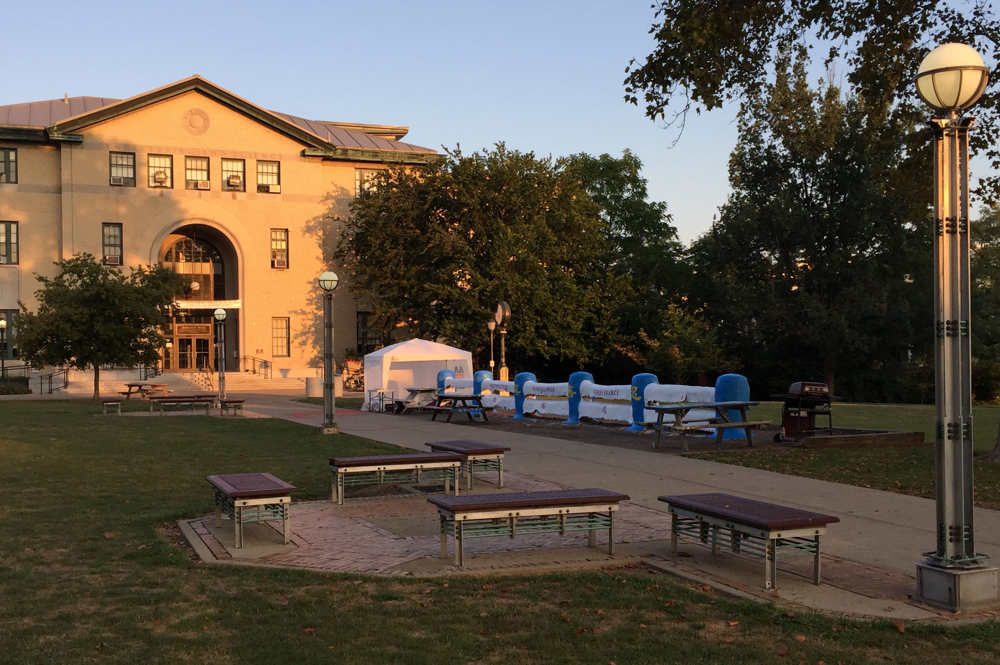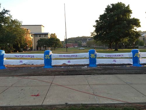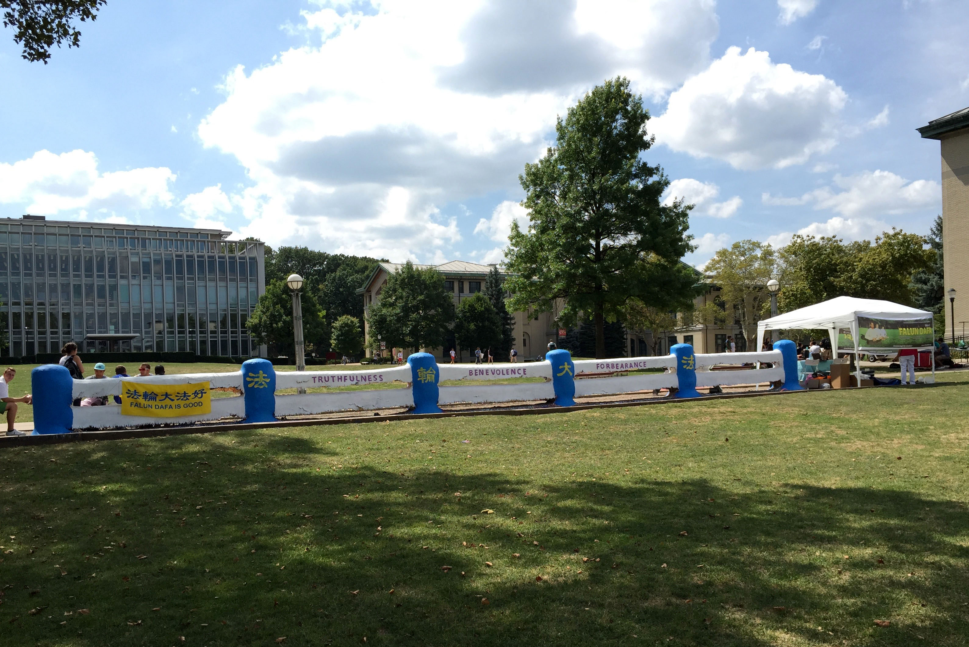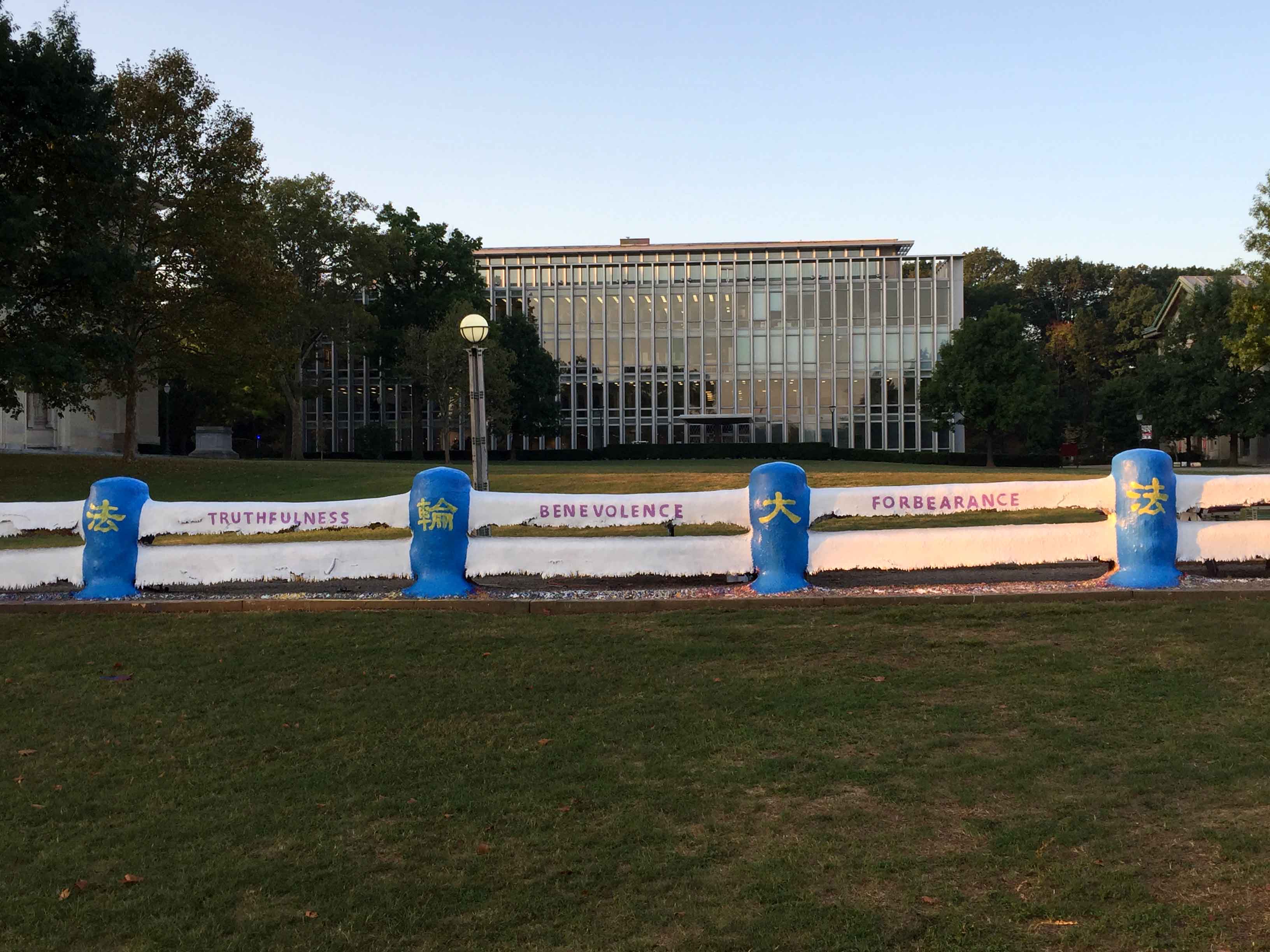 ![]() 图1-4:卡内基梅隆大学校园内一景:该校的“法轮大法之友”将校园草坪上的“栅栏”刷上了“法轮大法”和“真、善、忍”,非常引人瞩目。 |