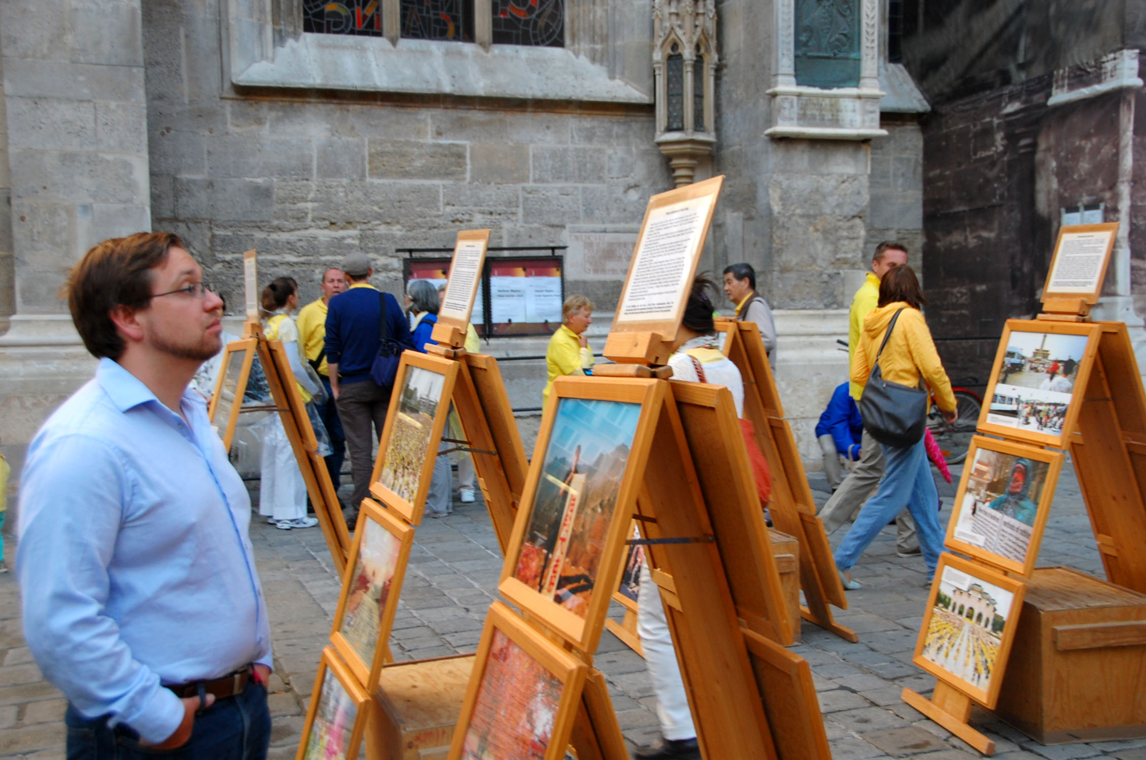 Stephen先生是位来自纽约的工程师,他碰巧路过,看到法轮功学员的活动。他在英文真相展板前驻足,了解真相。他对学员表示,他经常听说关于中共的一些事情,但是没听说过什么好事,都是些中共干的坏事。当他看到法轮功学员被活体摘取器官的真相展板,他觉得简直是太可怕了。当他听学员介绍法轮功在纽约也有炼功点时,他决定回美国后继续关注法轮功,并拿走法轮功传单,表示很感兴趣。他并表示要来看法轮功学员在次日举行的维也纳大游行活动。