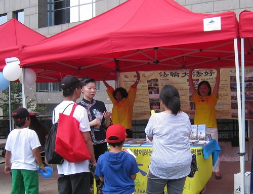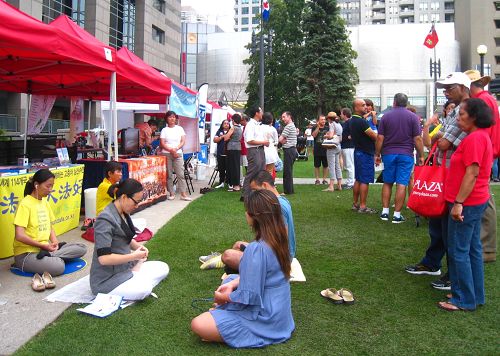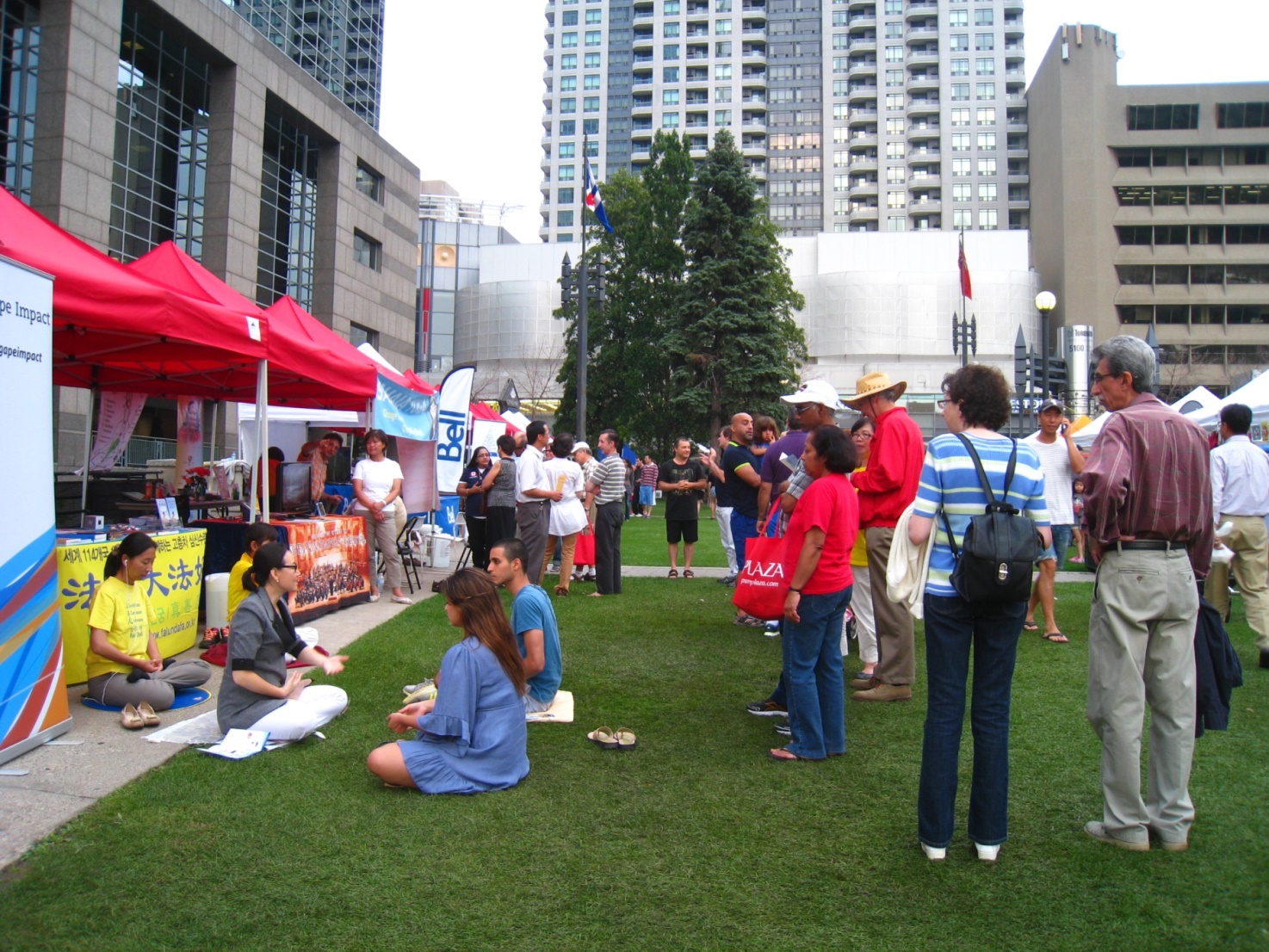 两天的活动中,法轮大法展位处热闹非凡,参观者中,有的驻足了解法轮功的真相并学炼功法,了解真相的民众还签名支持制止迫害,有来自中国大陆的民众现场做“三:退.”(退出中共党团队)。