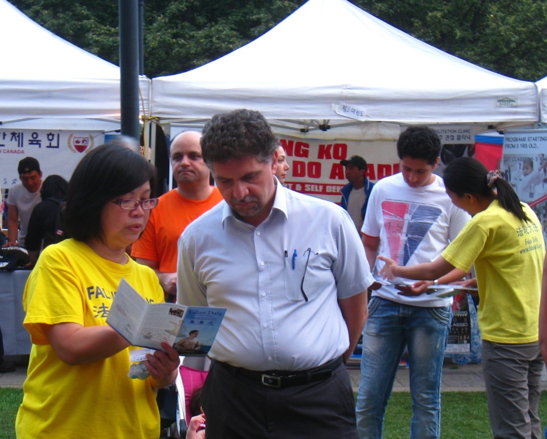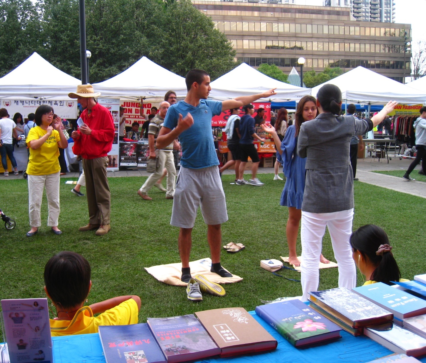 瑞尔森大学学生Farid Green在展位处被法轮功学员展示的功法所吸引,就跟朋友停下来跟法轮功学员学炼起了功法动作。炼完后,Green说:“这个功法跟我以前炼的太极不同。太极比较注重身体的运动和细节,而法轮功不是,而且两者所遵循的原理也不同。”
