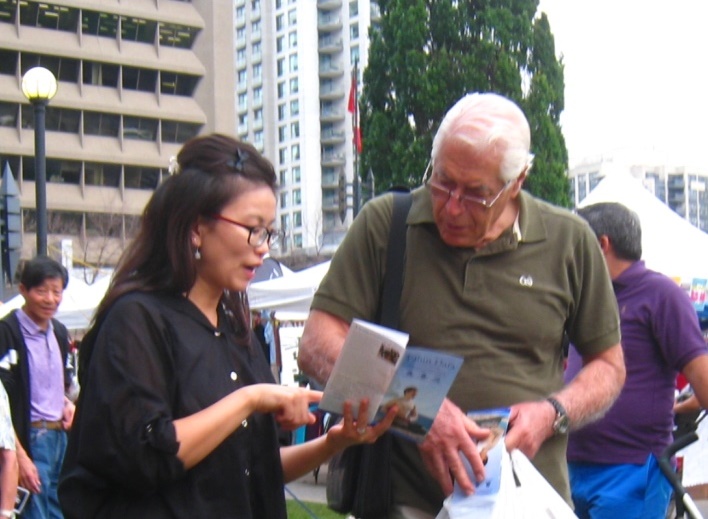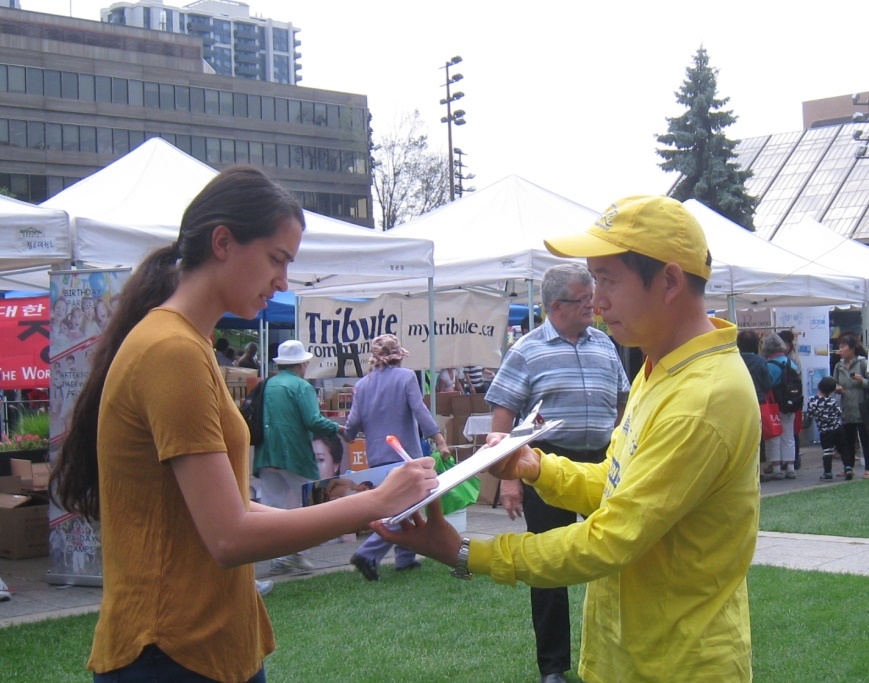 多伦多大学学生Sophia Kwon在路过法轮大法展位时告诉法轮功学员,说她已经看过法轮功的主要书籍《转法轮》了,她非常喜欢这本书。她在制止中共活摘法轮功学员的征签表上签名后说:“中共害怕法轮功,是因为法轮功太强大了。我支持法轮功!”