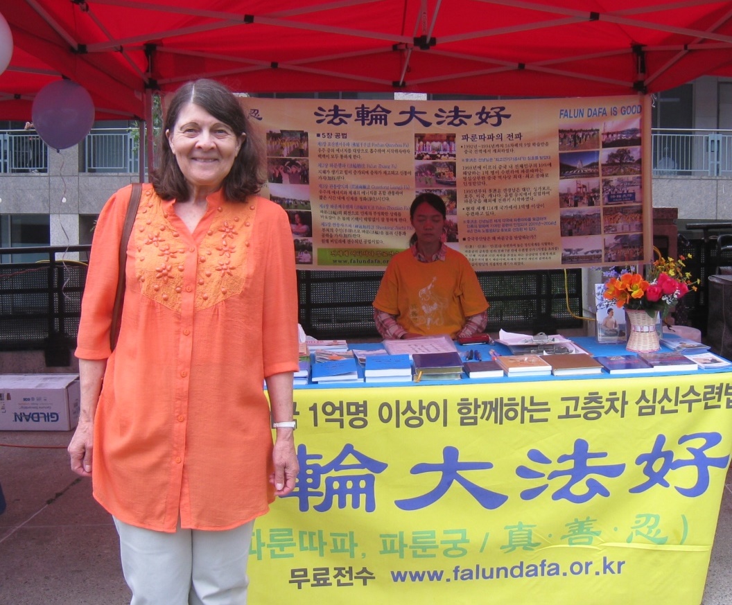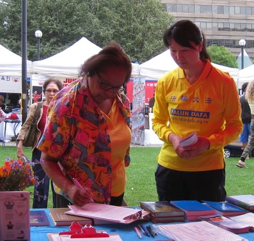 多伦多退休教师Lesly Krumins女士在法轮大法展位处了解到真相后,毫不犹豫在制止中共活摘法轮功学员器官的征签表上签了名。Krumins女士说:“中国共产党太糟糕了!”“人们应该去支持那些想坚持他们信仰的请愿,我还没有遇到过这样的支持机会,但今天在这里我找到了。”