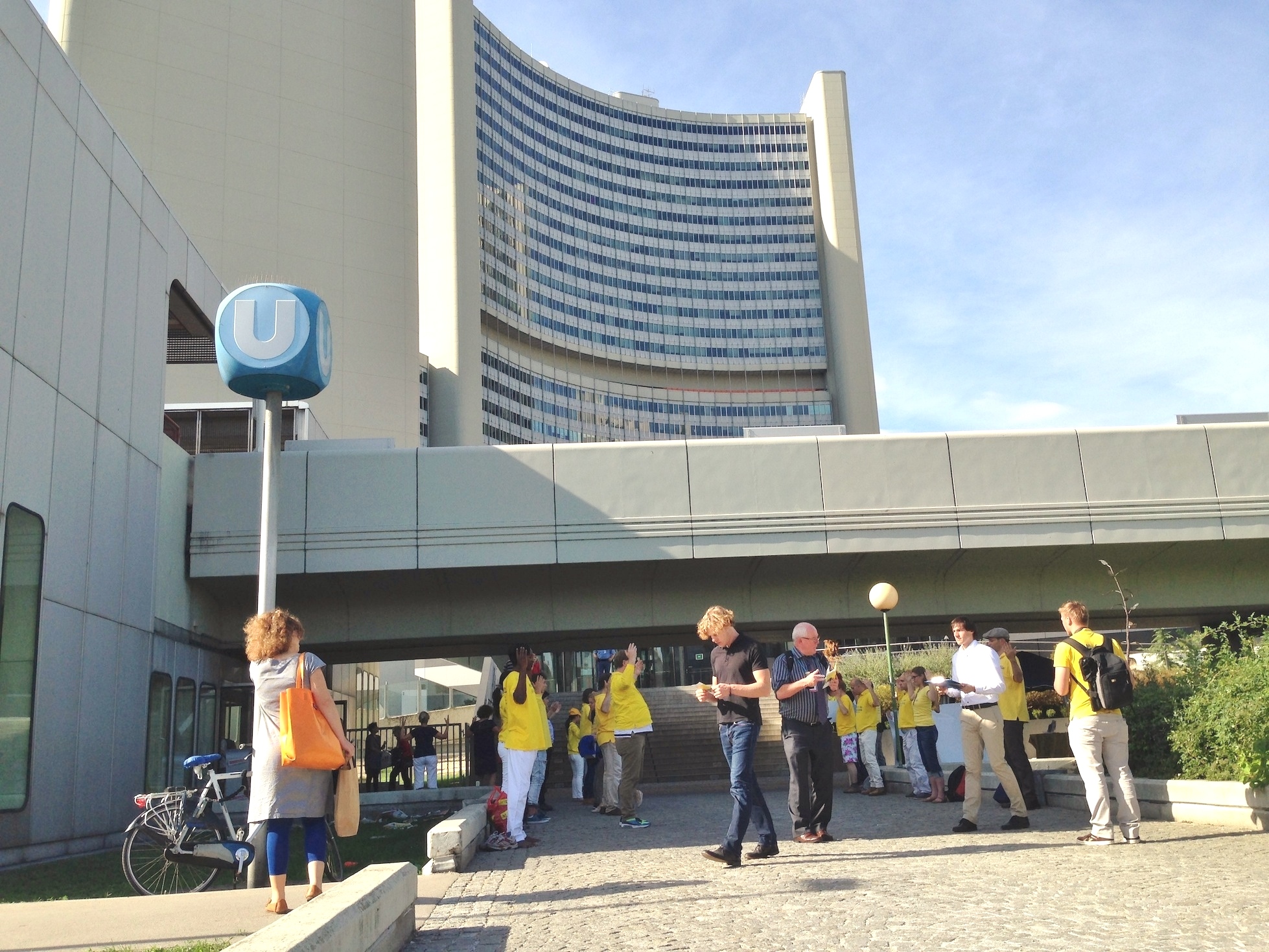 ![]() 图1-4: 二零一五年九月十八日星期五,欧洲法轮功学员在维也纳国际中心大夏外开展讲真相活动 |