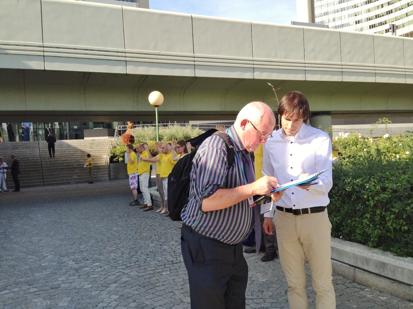 在活动过程中有位在大厦外执勤的联合国保安人员主动找到法轮功学员,问是否愿意把法轮功学员大力支持的谴责活摘的请愿征签正式交到联合国大厦里面去,随后,维也纳联合国大厦当天的安全负责官员(security inspector on duty)来到大厦前正式接受法轮功学员卡佳(Katja)面对面讲述中共迫害法轮功真相,并递出有关中共活摘罪行的真相资料和“医生反强摘器官国际组织”的请愿诉求。该位安全负责官员许诺要把这些资料寄给位于纽约的联合国总部。