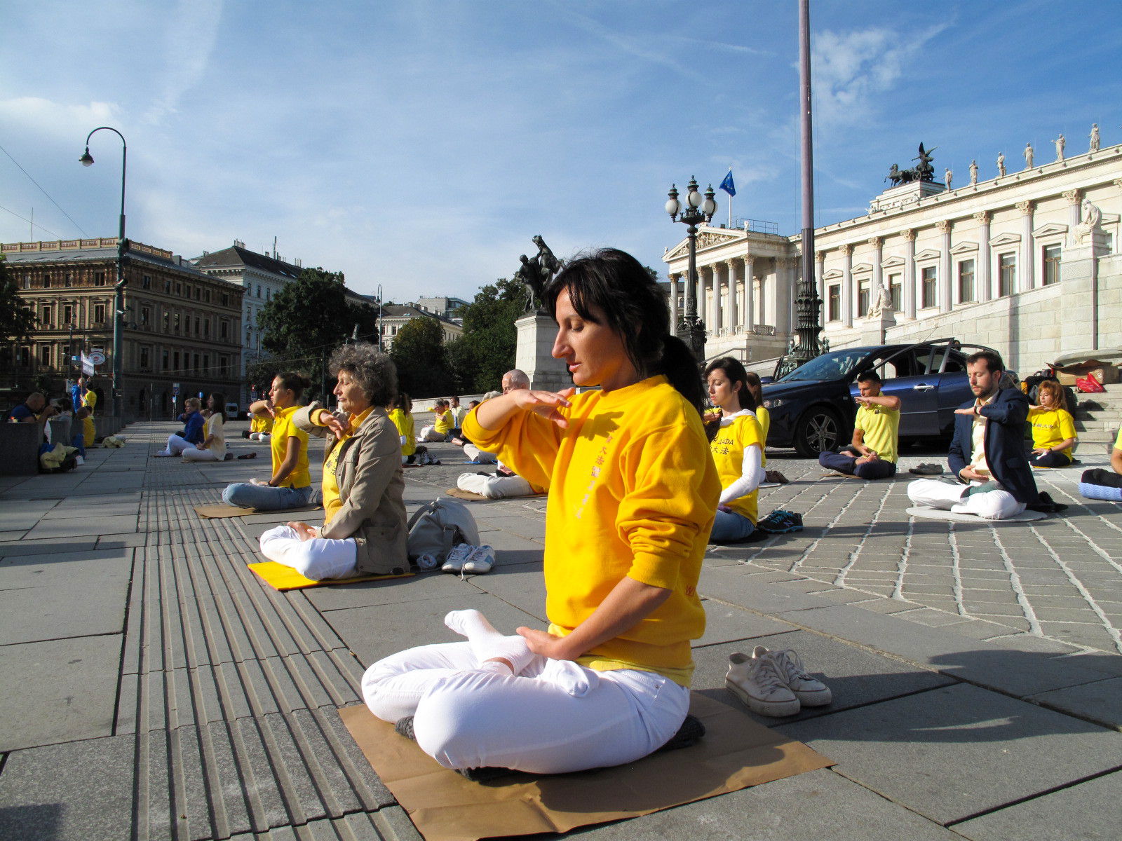 ![]() 二零一五年九月十九日星期六,部分欧洲法轮功学员在奥地利国会大厦(The Austrian Parliament)前集体炼功 |