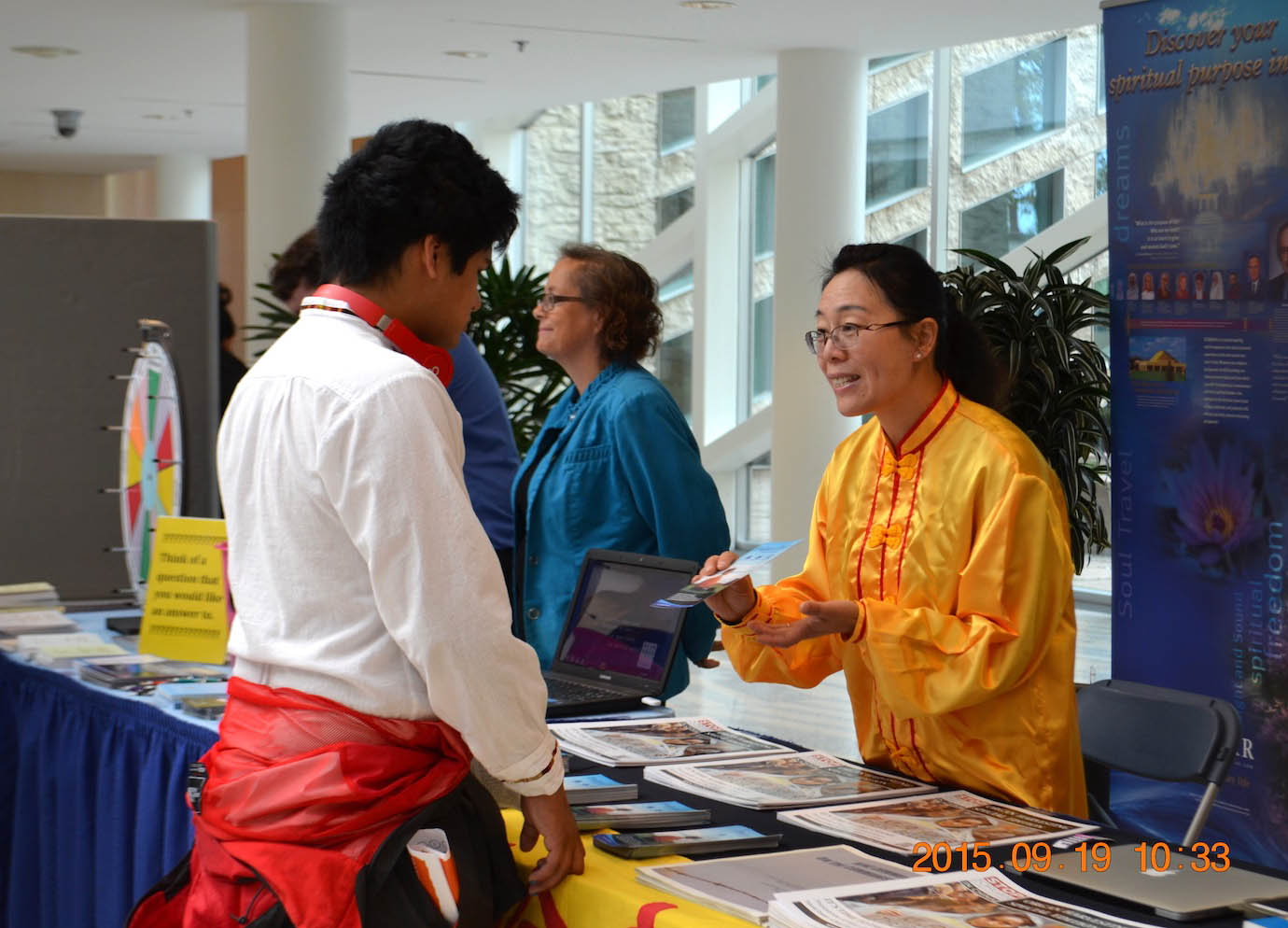 活动从早上九点半开始到下午四点结束,前来了解情况的民众络绎不绝。来自各个信仰组织的成员和前来参加活动的民众来到法轮大法展位前,向工作人员了解法轮功的情况。