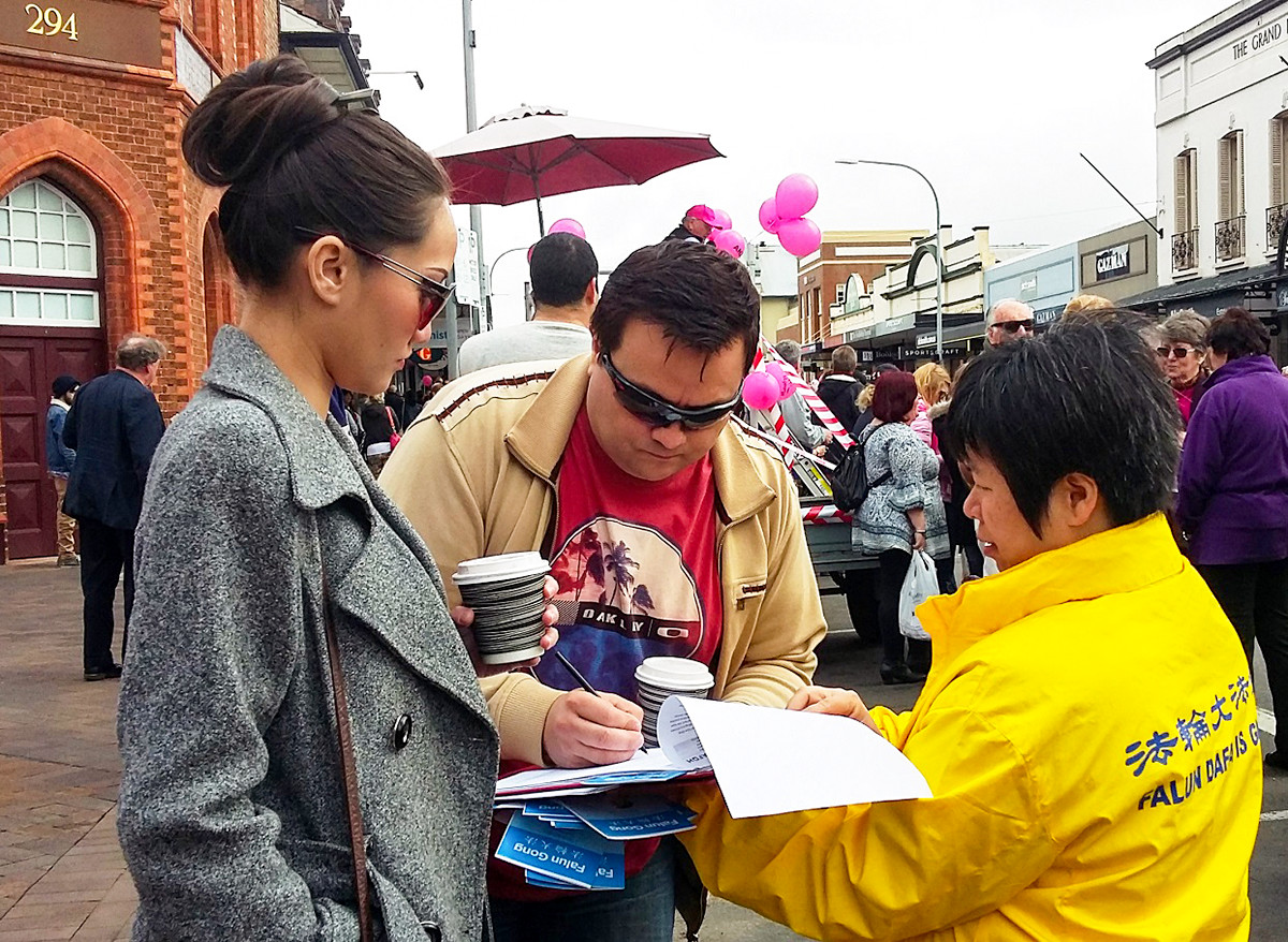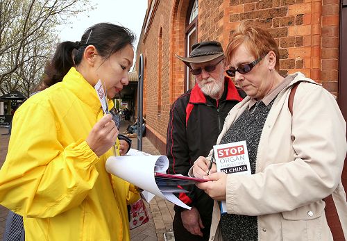 与丈夫一起来观看游行的梅尔(Mair)女士在签名时表示,她已经听说了有关中共活体摘取法轮功学员器官的事情。她说,她在奥克斯利学院(Oxley College,宝柔地区的一所独立私校)读书的儿子做过关于这一内容的学习和调查。而她在悉尼大学学医的大儿子回家时也与父母谈到过有关这方面的事,并说悉尼大学也牵涉到了这个问题,因为悉尼大学的医学院曾给了涉嫌参与活摘器官的前中国卫生部长黄洁夫荣誉教授的名誉,而一些教授要求校方更正错误的做法。梅尔表示:发生这样的迫害是无法接受的。