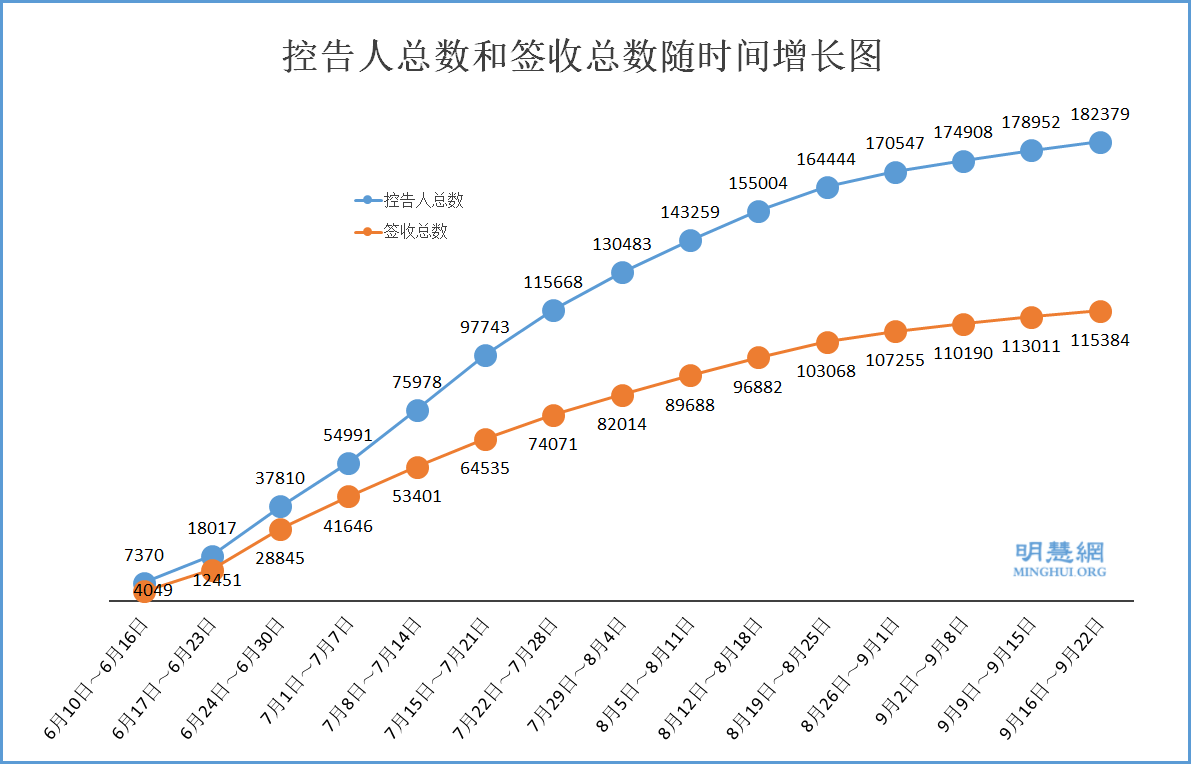 从5月底到9月22日,明慧网已收到总数182379名(153853案例)法轮功学员及家人递交给中国最高检察院、法院、公安部等相关部门的诉讼状副本。8月22日至9月22日一月内,超过23068人(20504案例)递交诉状控告江泽民。由于网络封锁和信息传输的不便,实际数字不止于此。