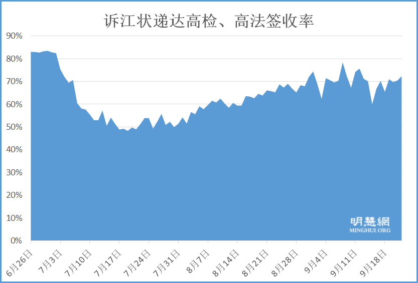 ![]() 图2:6月26日至9月22日诉江状递达中国最高检察机构的签收率。目前,中国高检、高法已收到至少95999份(115384人)来自中国和世界各地的控告江泽民的诉讼状。 |