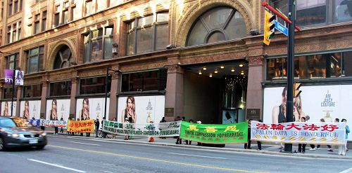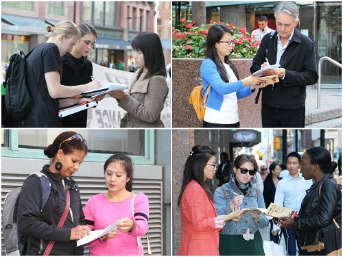 ![]() 图1-4:九月二十一日(星期一)下午四点至五点半,多伦多部分法轮功学员在市中心最繁忙的Yonge(央街)和Queen街交界,举行“声援诉江大潮”真相长城和举报江泽民征签活动。 |