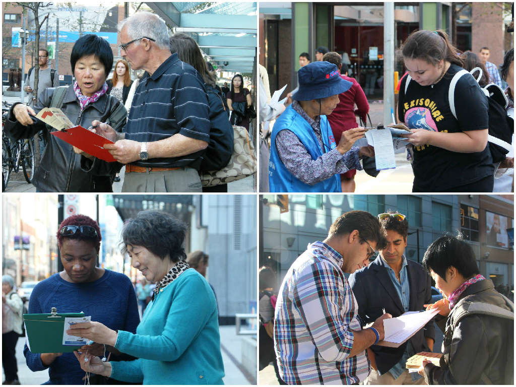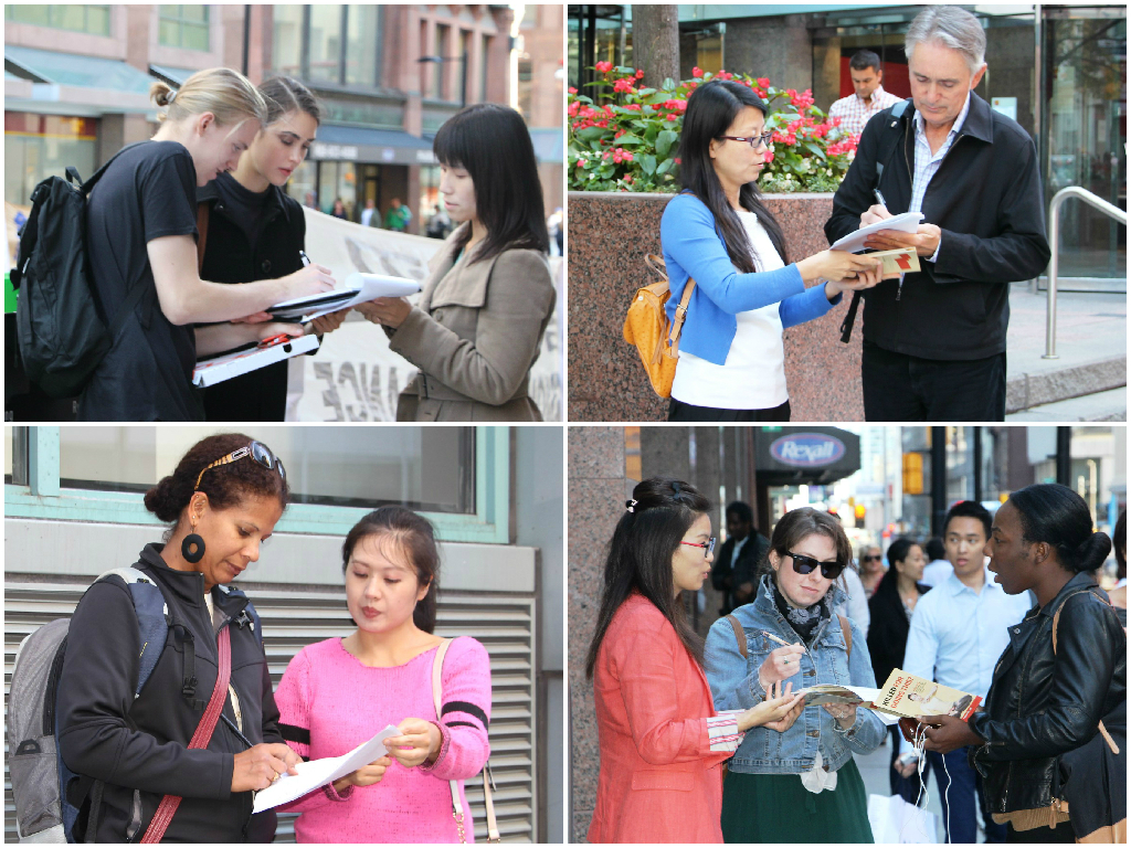 正直诉江大潮风起云涌之际,二零一五年九月二十一日(星期一)下午四点至五点半,加拿大多伦多部分法轮功学员在市中心最繁忙的Yonge(央街)和Queen街交界,举行“声援诉江大潮”真相长城和举报江泽民征签活动,活动主题“起诉江泽民,退出邪*党-,走向未来”。这里是多伦多的金融中心,集中了很多大的金融公司和大银行,正值下班时间人山人海,很多白领人士知道了真相后,都表示要把江送上审判台,越快越好。一个半小时的活动,在《致中华人民共和国最高人民检察院举报中心联名举报江泽民的罪行》征签表签名的有三百零八位民众。