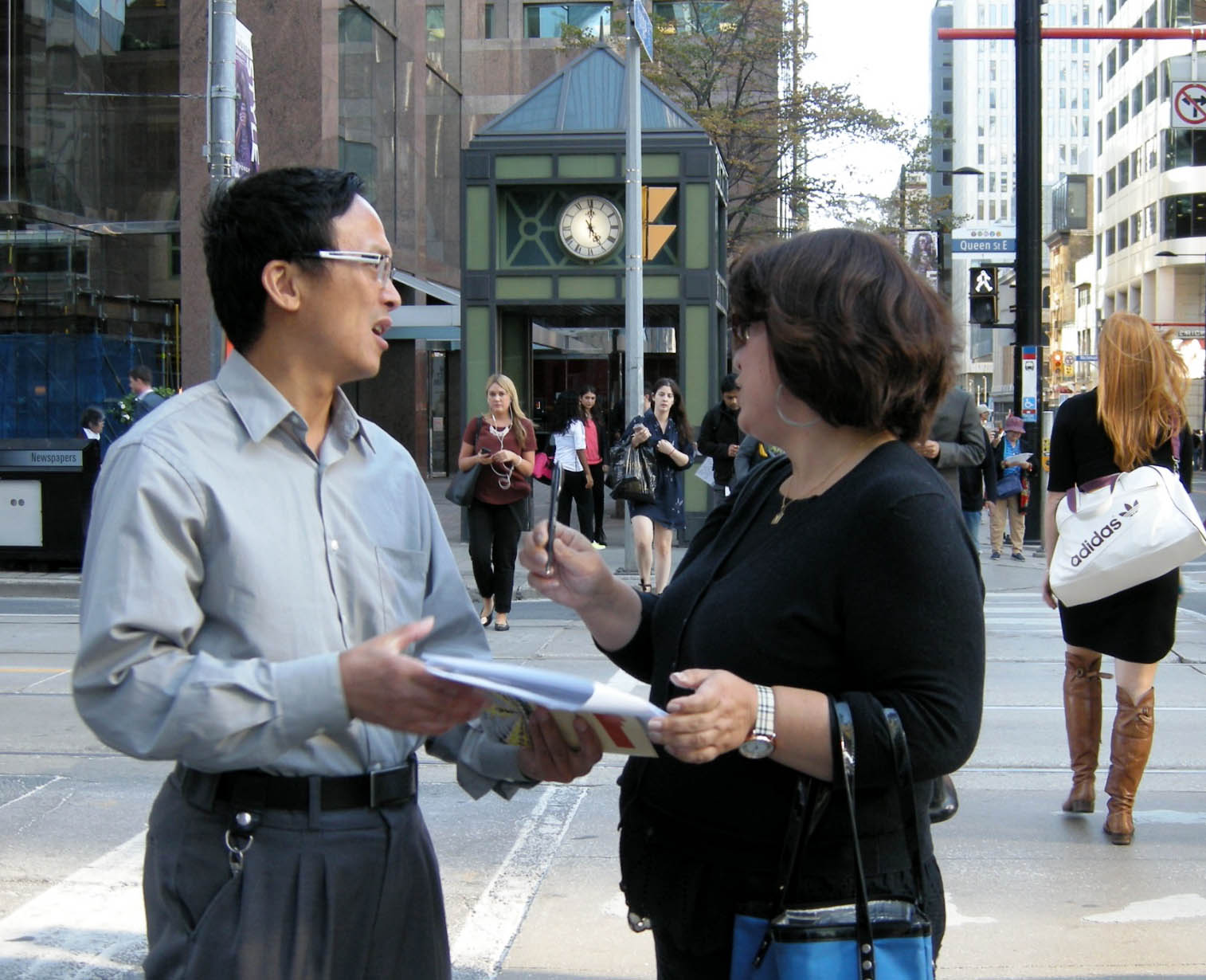 一位来自香港的年轻男子,来多伦多出公差,明天就去美国。他在举报江首恶的签名表上签完字后说,在香港他看到很多法轮功学员在努力;在美国他也见到炼法轮功的人。他说香港被独裁政权糟蹋的不象样了,学生坐不住要起来争取民主。他说在香港他很支持学生。当学员对他说他的签名能帮助到无辜的法轮功学员不再受到杀戮,能将邪恶绳之以法时,他说: 祝你们成功!