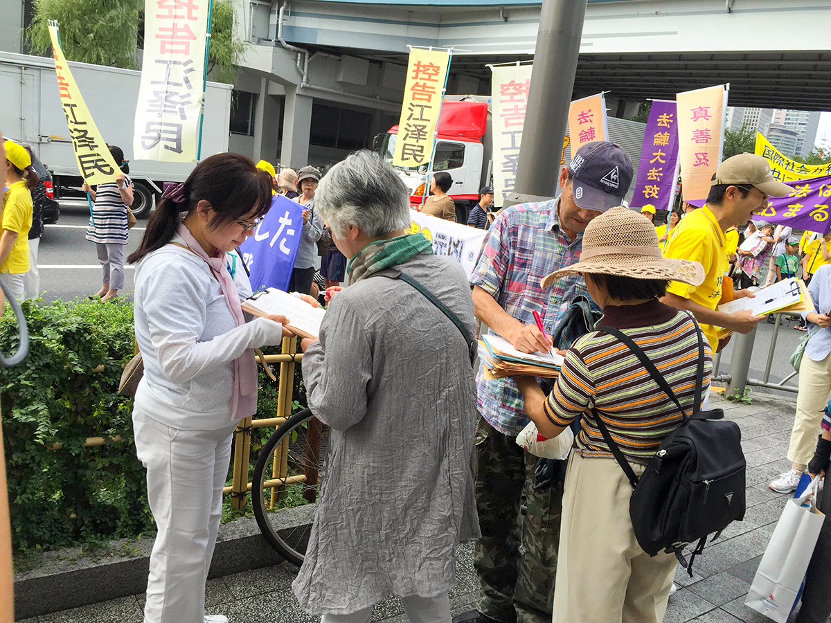 游行队伍打着“把迫害法轮功元凶江泽民送上法庭”、“停止活摘法轮功学员器官”等横幅,沿途经过东京站、银座等繁华地区。许多路人看到游行队伍和听了法轮功学员讲述在中国的法轮功学员遭受的迫害,纷纷伸出正义之手,签名支持控告迫害法轮功的元凶江泽民。