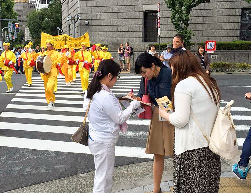 有位日本女士边签名边说:“我知道法轮功,在中国被迫害的很严重,我支持你们,要加油哦!”有几位在车站等车的日本人看着游行队伍的控江横幅,接过真相传单看了之后二话没说拿笔就签名。