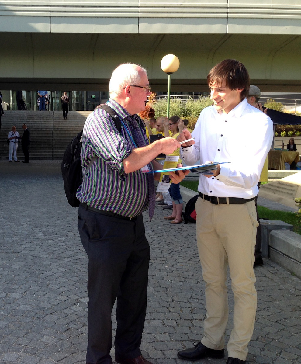 ![]() 二零一五年九月十八日,迈可尔在维也纳联合国城外向路过的联合国工作人员讲真相、征签 |