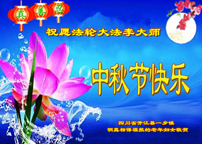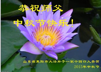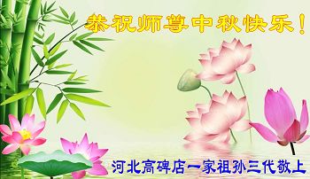 在此万分感谢李大师!感谢法轮大法!我一定牢牢记住“法轮大法好、真善忍好”,积极支持老伴修炼法轮功。法轮大法真神通,给了我一个健康的身体、幸福的生活、美好的家庭。谢谢法轮大法李大师,诚心敬祝李大师中秋节快乐!