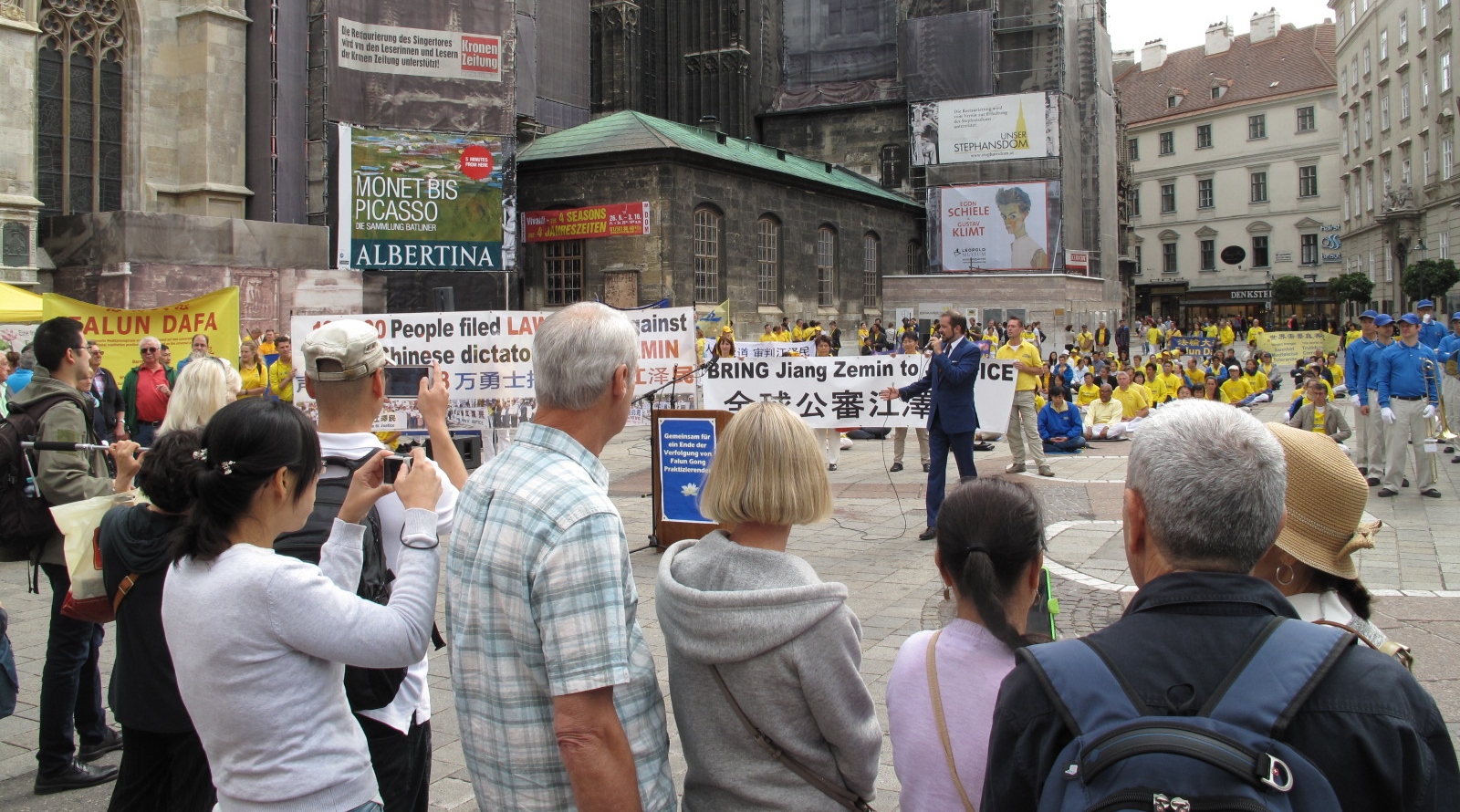 ![]() 图1:二零一五年九月十九日上午,欧洲法轮功学员在维也纳斯特凡大教堂前广场举行反迫害、声援全球控江集会 |