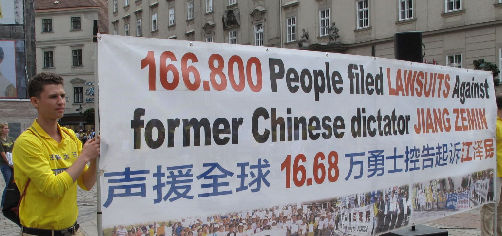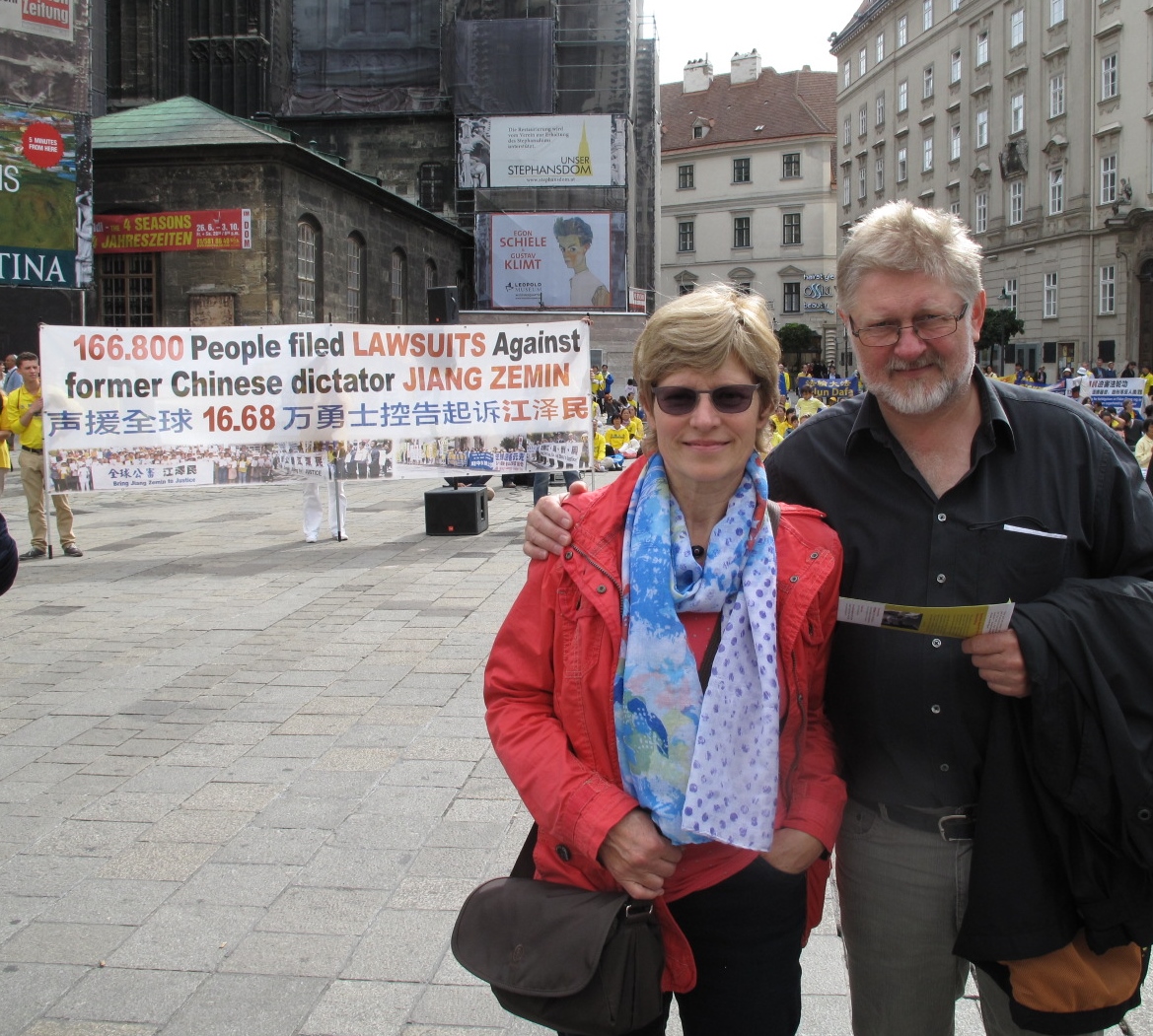 在法轮功学员反迫害、声援全球控江大型集会的发言过程中,正在游览维也纳斯特凡大教堂前广场的一对德国夫妇认真聆听了有关中共活摘器官罪行、全球控江大潮等发言,然后签名支持制止迫害。