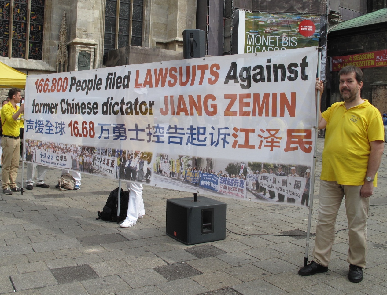 集会结束后,比利时学员劳伦斯(Laurence)仍然站在广场上,打着“声援全球16.68万勇士控告起诉江泽民(166,800 People filed Lawsuits against Former Chinese Dictator Jiang Zemin)”横幅。二十五岁的他修炼两年了,而他的爸爸、妈妈和姐姐都是修炼近十年的法轮功学员。当被问及他为什么要这样抓紧时间向广场游人展示横幅传递信息时,劳伦斯讲起了这个横幅的来历和目的:他爸爸希望所有中国人了解中共迫害法轮功必败、正义必胜的信息。他介绍说: