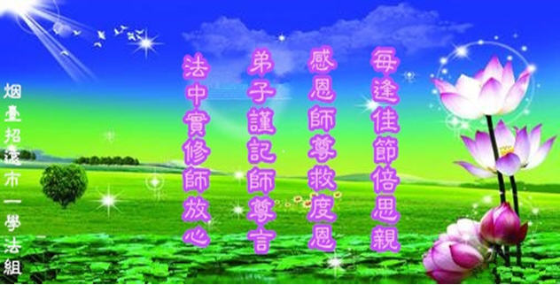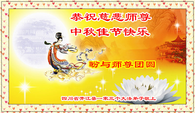 在这阖家团聚,欢度良辰之时,弟子感谢师父的救度之恩,师恩浩荡,弟子想念师父。弟子要精進实修,修炼如初,做好三件事,救度更多的众生,兑现史前大愿。圆满随师父回家!弟子全家叩首跪拜师尊!合十!
