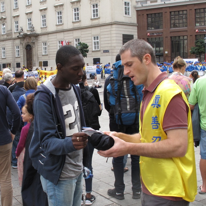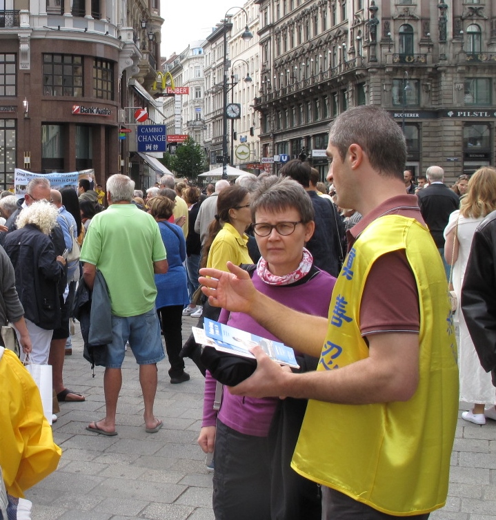 ![]() 图:2015年9月19日,欧洲法轮功学员在维也纳斯特凡大教堂前广场举行反迫害、声援全球控江集会,意大利法轮功学员安德烈(Andrei)在广场人群中发传单并讲真相 |