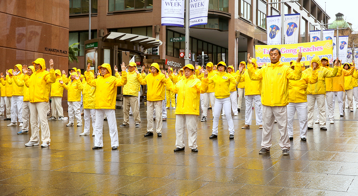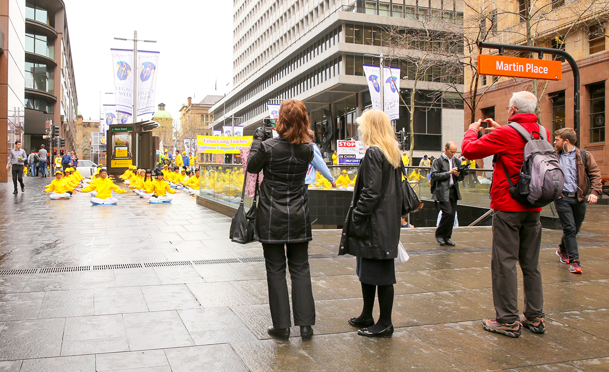 从中国大连来悉尼开会的一位先生聚精会神地看着法轮功学员炼功。在与学员的交谈中他表示,两天前他从市中心拿到的一份《大.纪.元;》报上看到了法轮功学员周五举行活动的消息,便决定来看。因为是第一次来悉尼,人生地不熟,所以他周四就出门打听马丁广场的位置,问了好几个人才找到。周五一早,同事们还在旅馆睡觉,他就一个人跑来看法轮功学员炼功了。