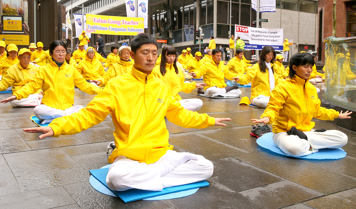 ![]() 图1-4:法轮功学员在悉尼市中心的马丁广场上集体晨炼 |