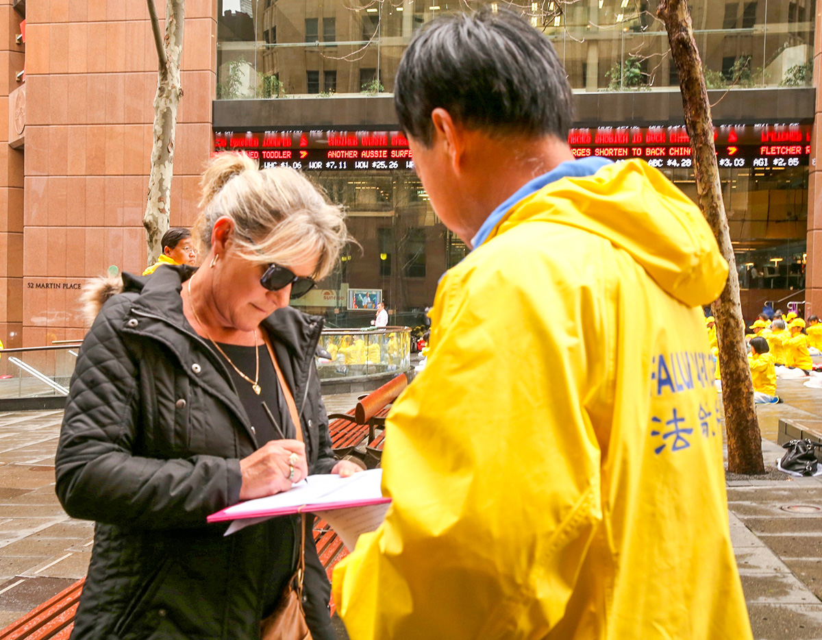 芭芭拉女士从麦觉理街一路走过来,径直走到设在炼功场旁边的征签台前,分别在制止中共活摘法轮功学员器官的请愿书和举报迫害元凶江泽民的举报书上签了名。她说,一定要帮助这些人(法轮功学员)获得正义(must help these people to get justice)。她将手捂在胸口说,当我了解到居然有人会因为器官而杀人的时候,我心里非常难过。