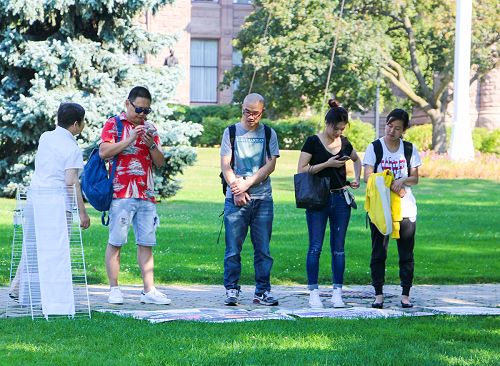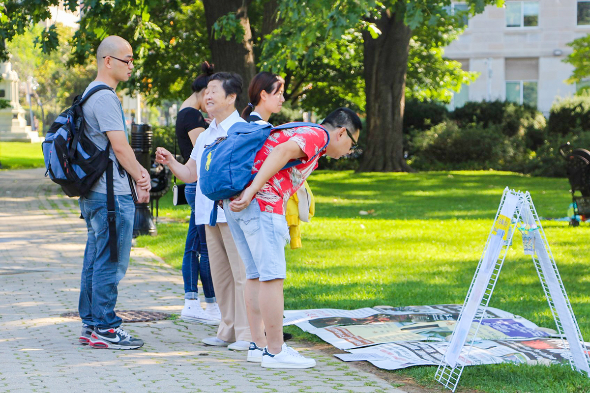 一天早上来了一群人,迎着“法轮大法好!”的横幅就过来了,其中一个走到展板前拿了一些资料。