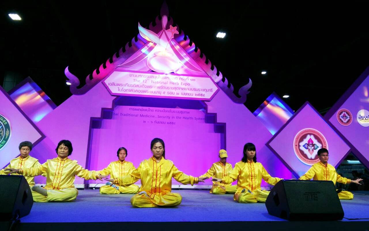 ![]() 图1:泰国中药博览会上,法轮功学员登台表演功法 |