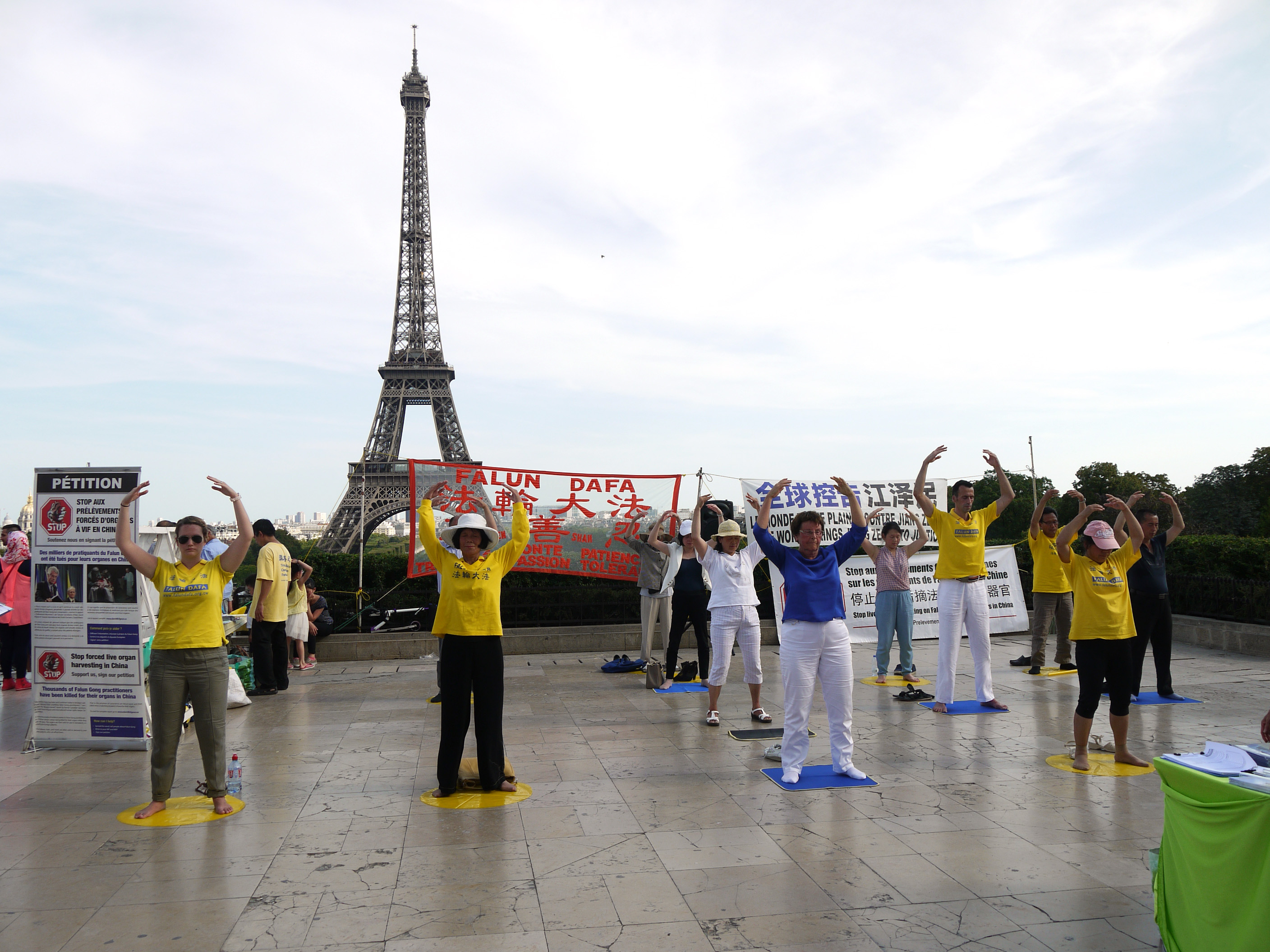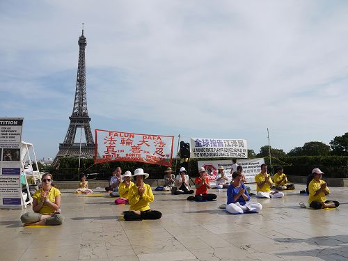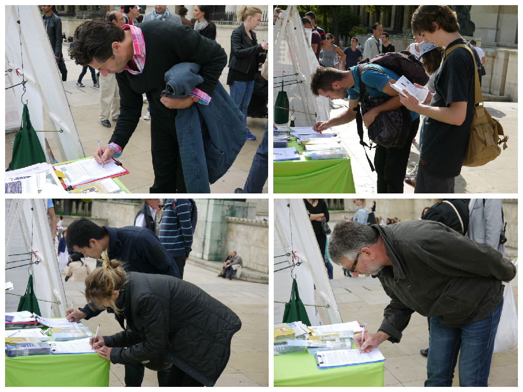 【明慧网二零一五年九月八日】(明慧记者周文英巴黎报道)二零一五年九月七日,金色的阳光照耀着初秋的巴黎。下午,部分法国法轮功学员来到艾菲尔铁塔下的人权广场,举行了集体炼功、讲真相的活动,并征集制止中共活体摘取法轮功学员器官的签名,同时声援起诉迫害元凶江泽民。来自世界各地的游人,被活动现场所吸引,有的拿出手机或相机拍照,了解真相后,他们纷纷在征签表上签名,支持制止“活摘”和声援诉江。