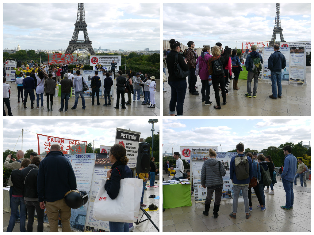 图1-2:二零一五年九月七日,部分法国法轮功学员在艾菲尔铁塔下的人权广场集体炼功和传播法轮功的真相,同时征集制止中共活摘法轮功学员器官的签名,及声援诉江。