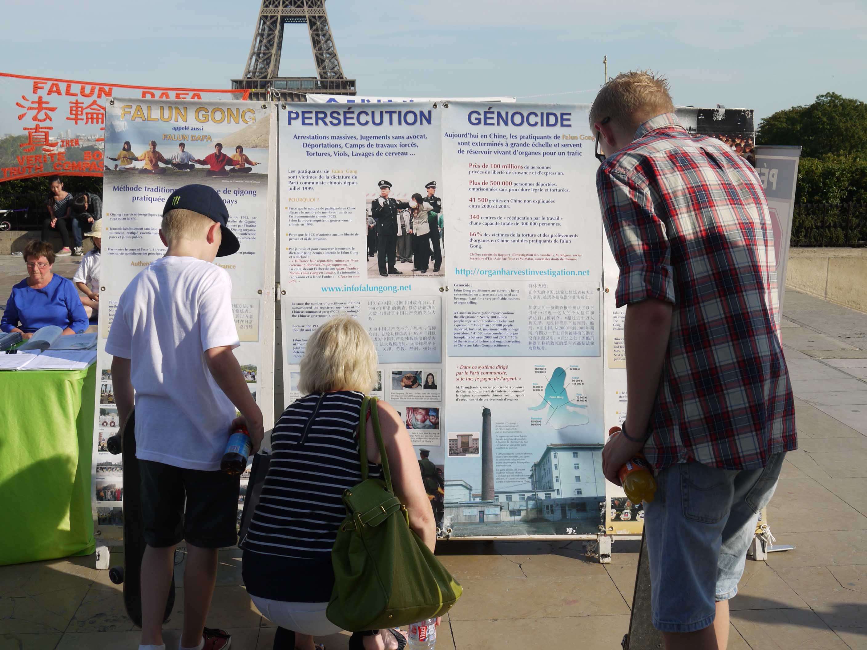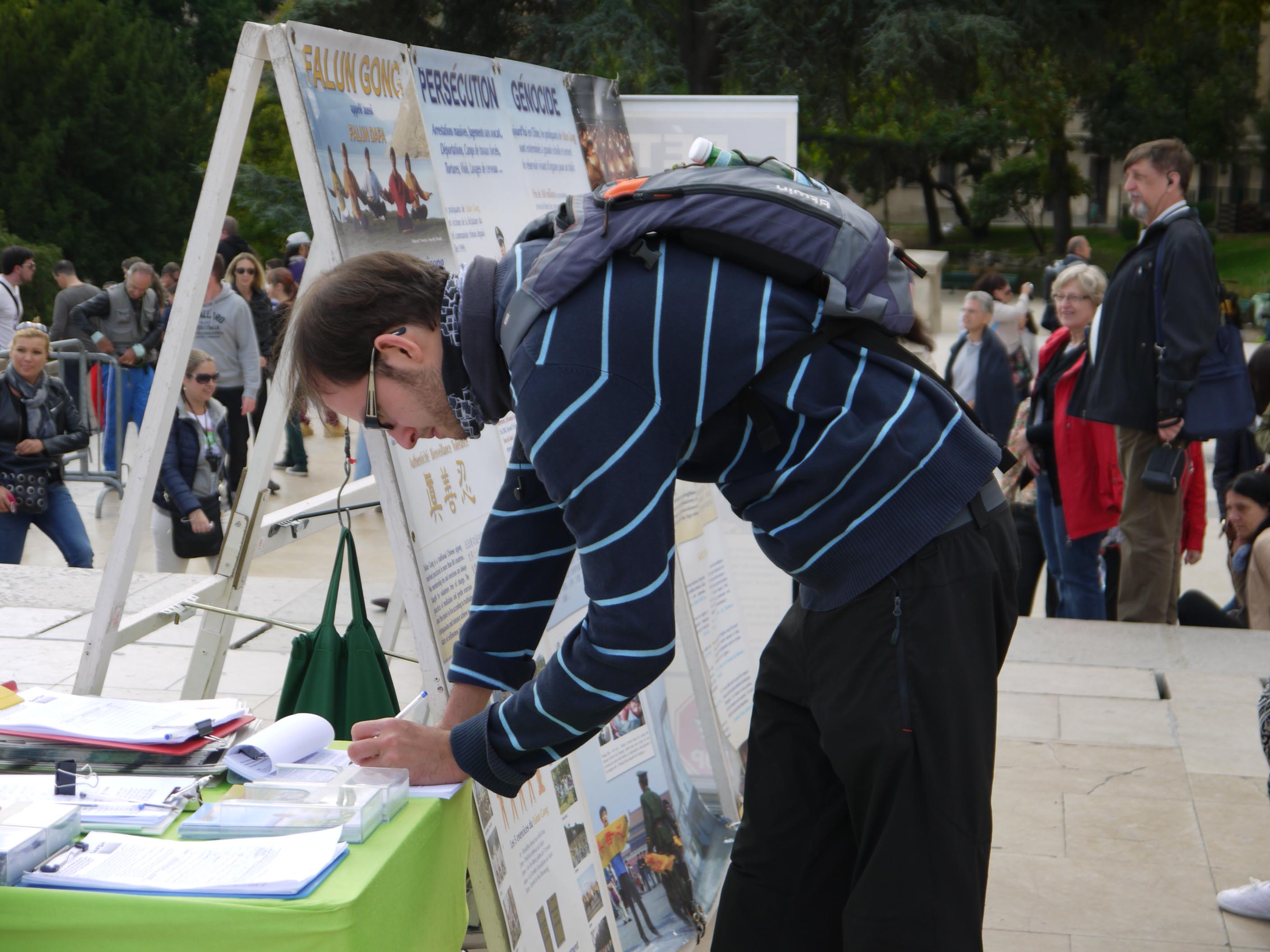 法国退休女士若赛特在法轮功真相展板前停留了很长时间,她了解到在中国因修炼法轮功而被迫害,法轮功学员甚至被活体摘取器官,她在征签表上签名后,并对法轮功学员说:“你们很有勇气,谢谢你们在这里告诉我们这些真相,坚持下去!”