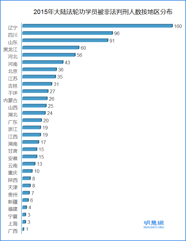 被非法判刑的法轮功学员来自29个省、自治区、直辖市,下图为各省被判刑人数的分布图。其中,被非法判刑人数最多的省份为:辽宁省160人,四川省96人,山东省91人。