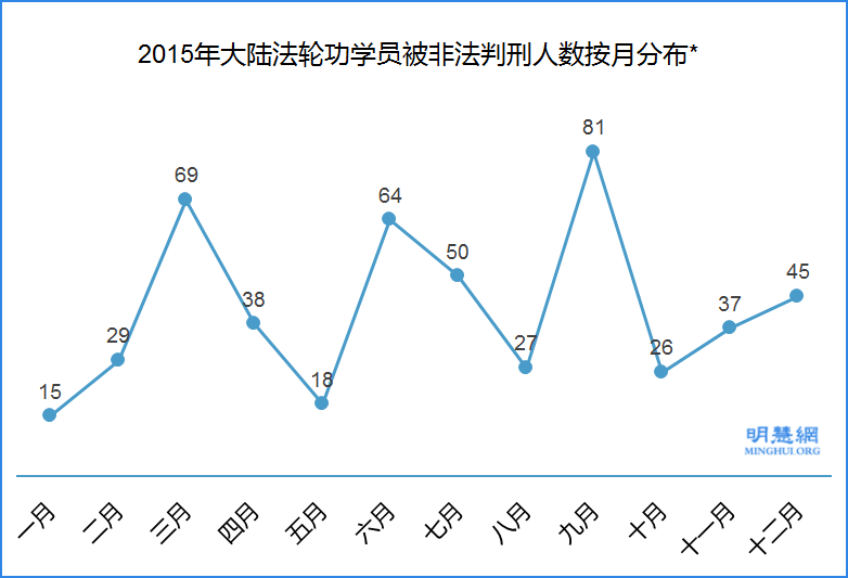 二零一五年明慧网报道的被中共非法判刑的法轮功学员共878人,其中男性252人,女性536人,另有90人性别不详。