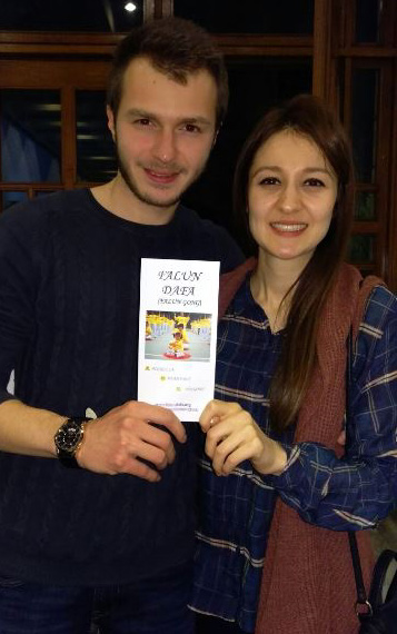 ![]() 两位大学生Didem Yurtsever 和Kerim Koc手持法轮功传单合影,表示希望开始学炼 |