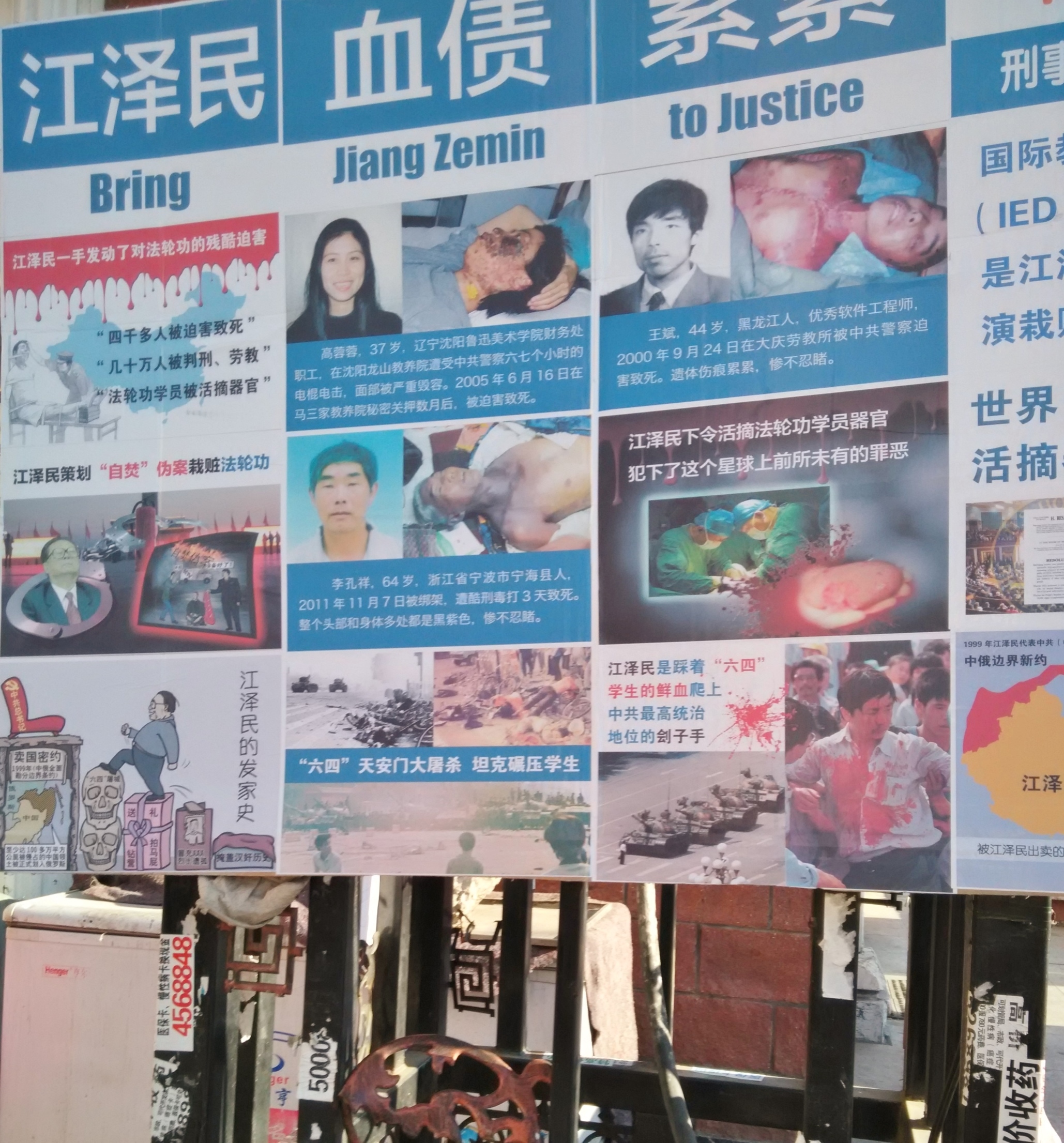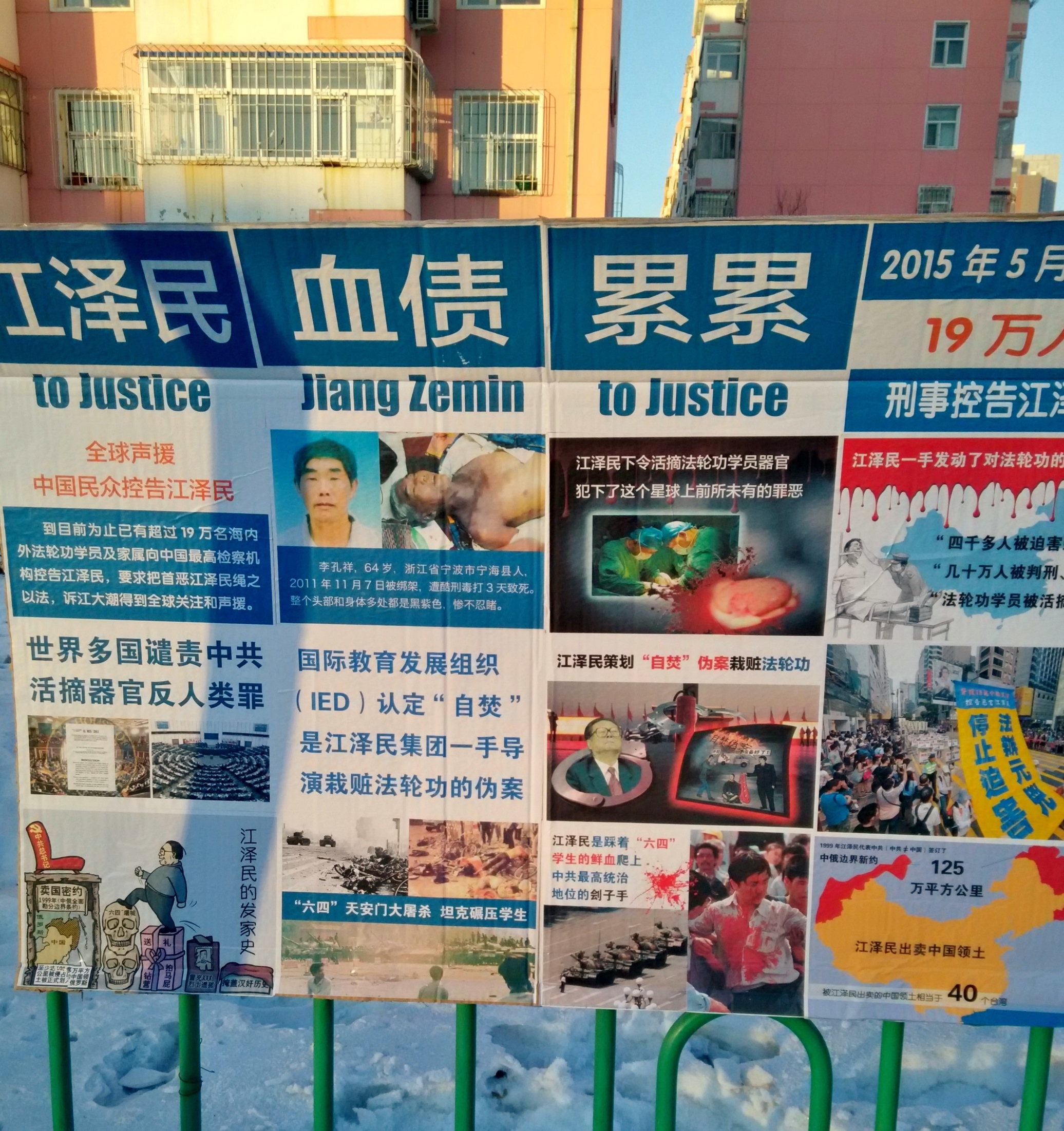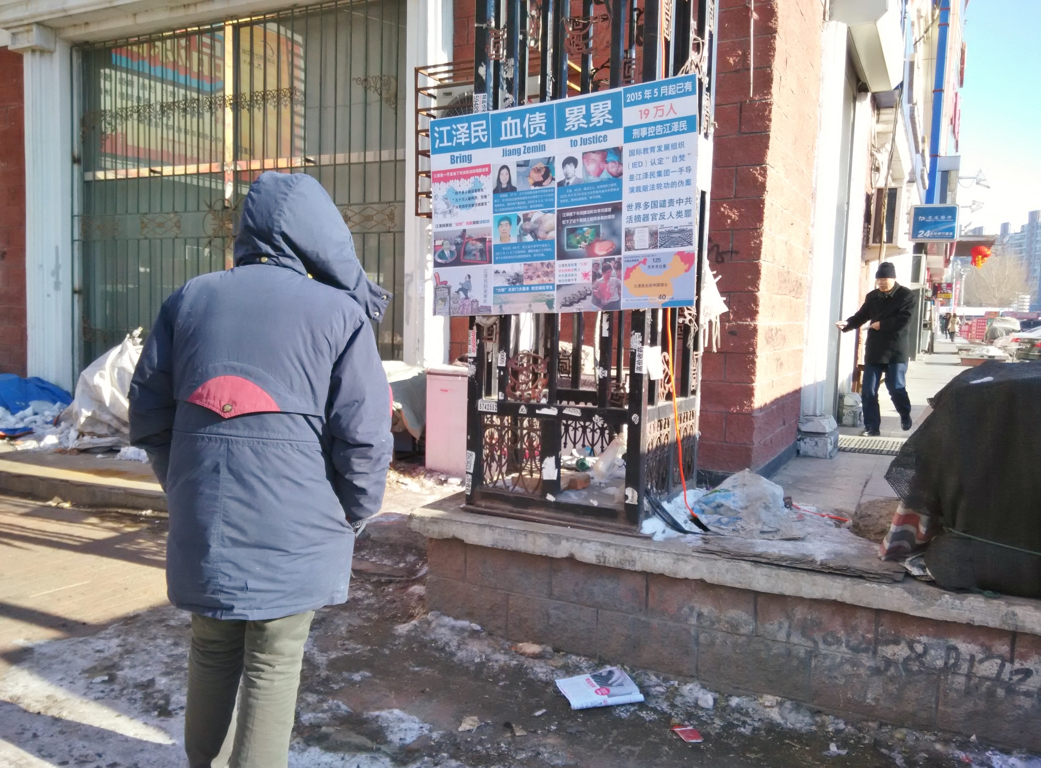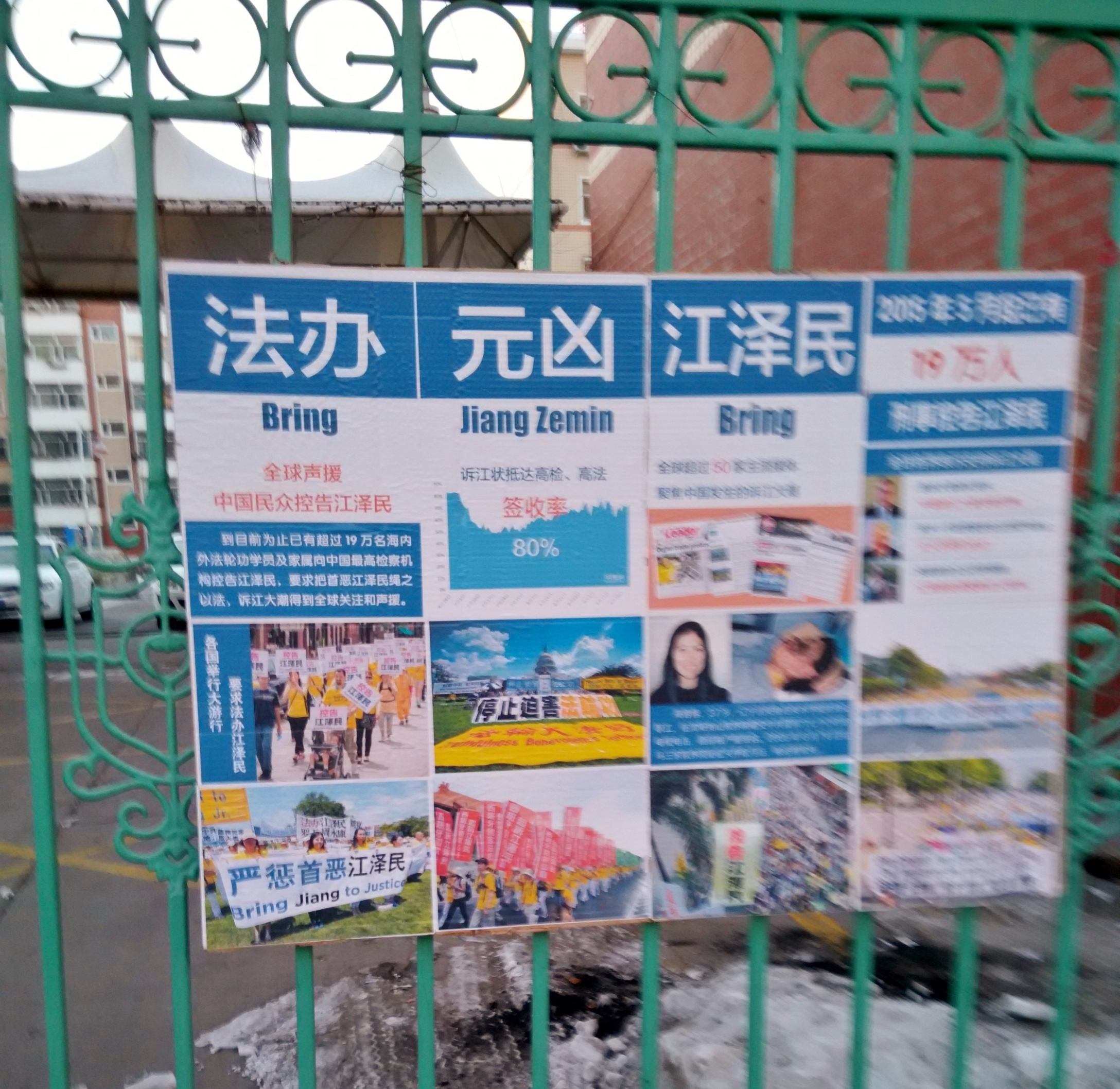 【明慧网二零一六年一月十三日】经过反复思考,终于想出了一个又省钱又方便的制做真相展板的方法。就是用纸壳比较好,用84x117厘米的纸壳就可以。不够大还可以拼。新旧都行,只要表面平整就可以。在展板中上两端的位置先用细铁丝穿透,到挂的时候打开铁丝一拧就行了。然后再按顺序粘图片。正好把铁丝盖住,不影响图片的效果。因为展板大不方便带,可以在纸壳背面就是图片中间缝上划开一道缝,千万不要划透。这样图片对准图片一折又好带又安全。选好地点用不了一分钟就可以挂好。最好在人多的地方,效果非常好,比如集市、商场、站牌等。