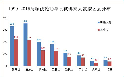 绑架迫害是抚顺市(四区三县)迫害形势之首恶,致使被绑架的法轮功学员迫害升级。其涉及范围之广,不分男女老少,不分何时何地,其表现猖狂、凶狠、无人性。据明慧网不完全统计:(1999.7——2015.5)期间抚顺市法轮功学员遭绑架人数1341名(2063人次),其中女性895名,占67%。数据分布见图所示: