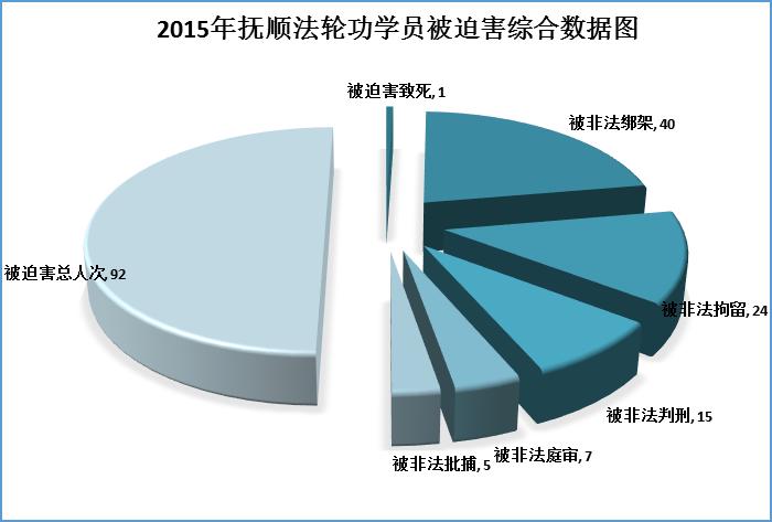 据明慧网报道所做的不完全统计,二零一五年抚顺地区法轮功学员被迫害致死1人,被绑架、拘留64人次,被非法判刑16人,被非法庭审7人,被非法批捕8人。见以下图表。