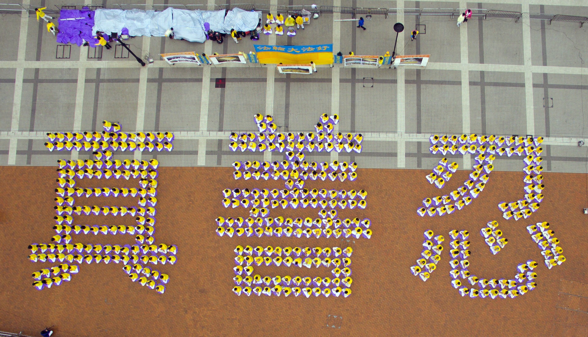 十六日清晨,超过五百名法轮功学员,身穿黄衣白裤的炼功服,在中环爱丁堡广场排出“真善忍”三个大字,他们在祥和的音乐声中集体炼功,殊胜的场面与祥和的氛围,深刻触动人心。虽然不时下着雨,丝毫没有影响活动的顺利进行。据了解,这是香港史上法轮功学员第三次排“真善忍”,第一次是在二零零一年一月的香港法轮大法修炼心得交流会(简称法会)期间。