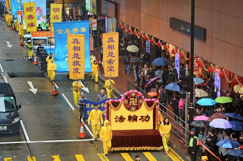 虽然一直下着雨,游行队伍途经两旁仍有许多市民和游客观看,他们纷纷拿着手机拍下游行的场面。从广州来的马先生表示是第一次看到法轮功游行:“感觉有点不可思议吧!比较惊讶!”他表示香港很自由,也认同应该尊重他人的信仰自由。