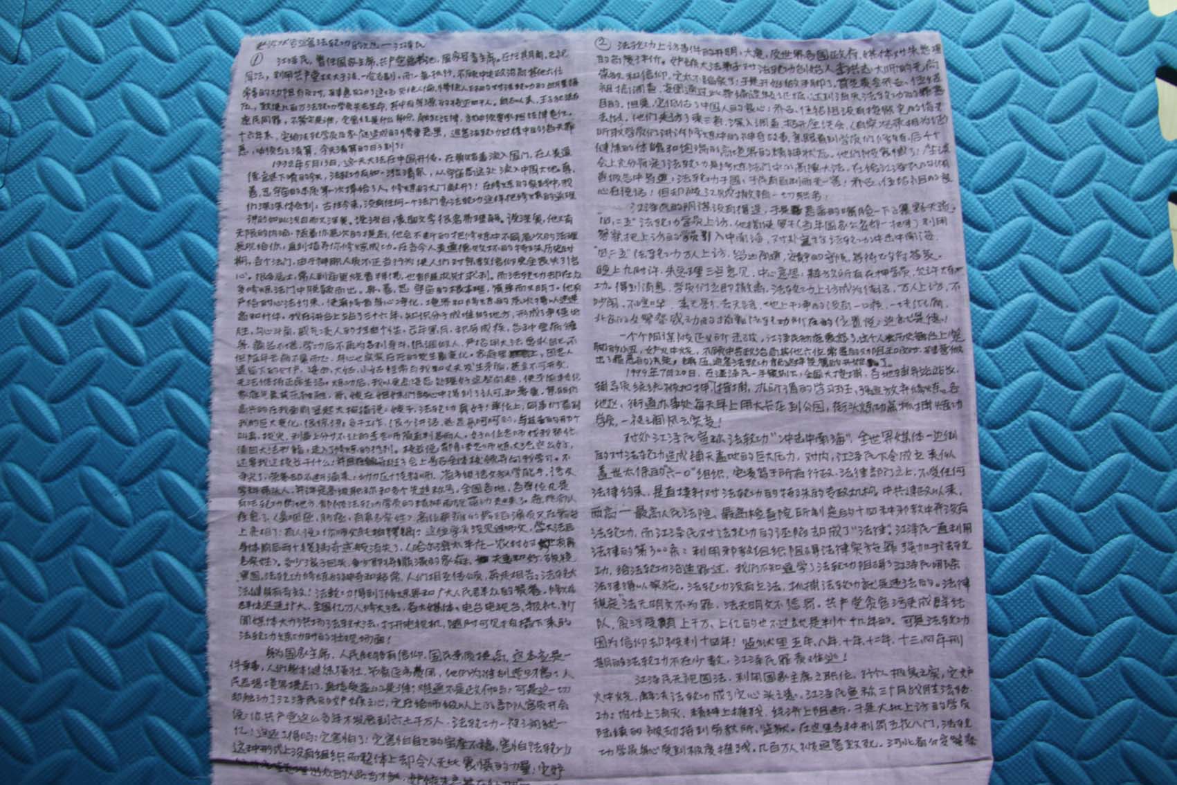 这是一份写在布条上的控诉,斑斑血泪,惨不忍闻。作者是六十五岁的退休女教师李文俊,难以想象她是怎样经受着黑狱中一分一秒的煎熬。