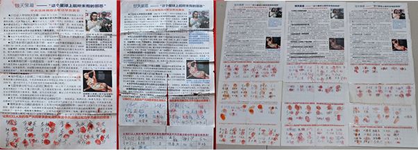 一个明白真相的中年男子说:“江泽民早就该死了,你们有贴的吗?给我一张,我自己给我的街门上贴一张,叫人们看。”当时对着好几个人,给他的街门贴上。