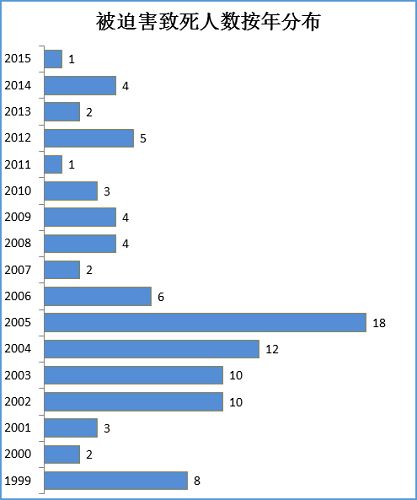 1999——2015年间,在97人中统计,每年被迫害致死人数见下表分布情况,未知哪年死亡的有2人。
