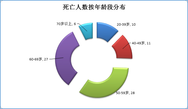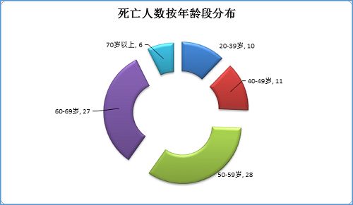 1999——2015年间,在97人中统计,其中(40—59)岁的中年人,占40%,年龄最小的27岁,未知年龄15人。见下表详细分布情况。