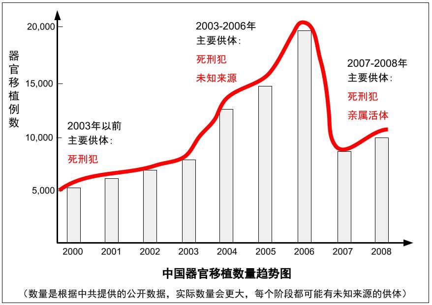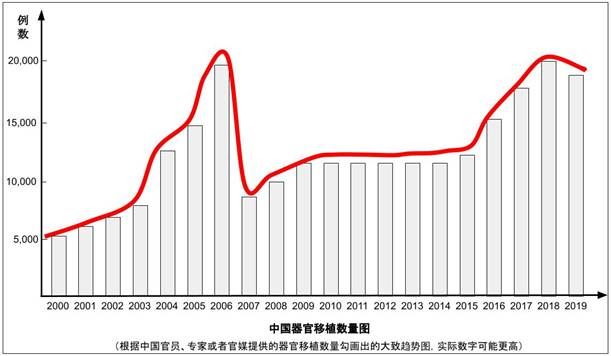 根据中共自己提供的器官移植数据,我们可以勾画出从2000年到2020年的大致曲线,虽然外界相信真实的数字要高得多。