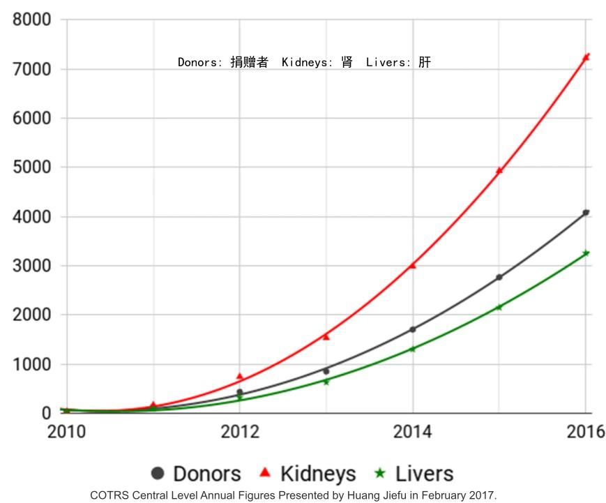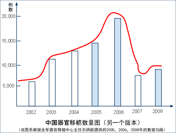 数量上屡创历史新高。黄洁夫称2004年中国的器官移植达到最高峰,光是肾和肝的移植数量就近1万3千例,[4]全军器官移植中心主任石炳毅在《科学时报》的采访中说2006年达到历史最高峰,这一年就有近2万例。[9]事实上中国的专家们对于到底有多少,哪一年是最高峰也是一头雾水。
