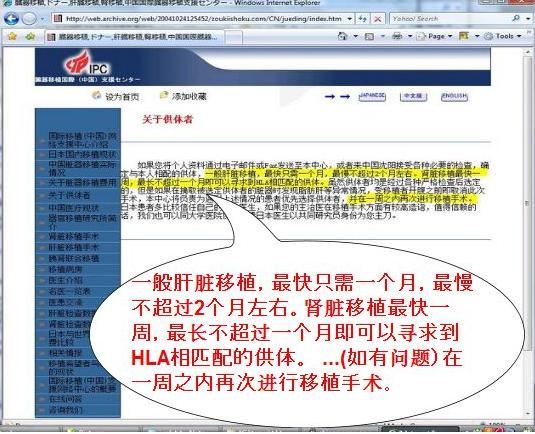 [143]中国医科大学第一附属医院的国际移植(中国)网络支援中心(沈阳):“肾脏移植最快一周”. 原网站已被关闭,存档链接: https://archive. is/zYHJ5
